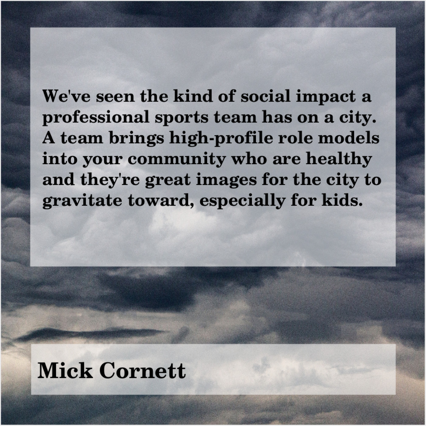 Mick Cornett Mick Cornett – We’ve seen the kind of… September 21, 2019 admin “We’ve seen the kind of social impact a professional sports team has on a city. A team brings high-profile role models into your community who are healthy and they’re great images for the city to gravitate toward, especially for kids.”-Mick Cornett