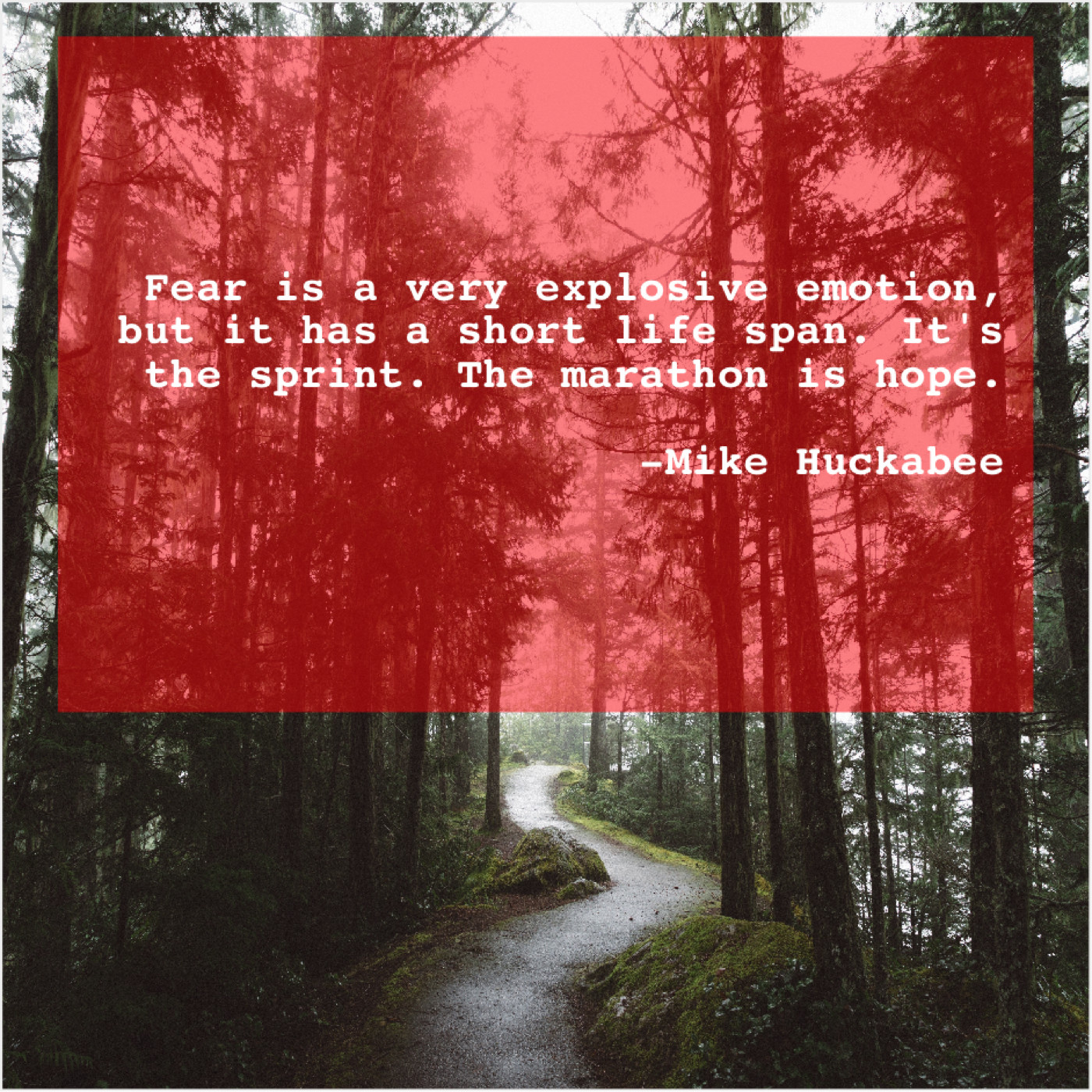 Mike Huckabee Mike Huckabee – Fear is a very explosive… June 11, 2019 admin “Fear is a very explosive emotion, but it has a short life span. It’s the sprint. The marathon is hope.”-Mike Huckabee