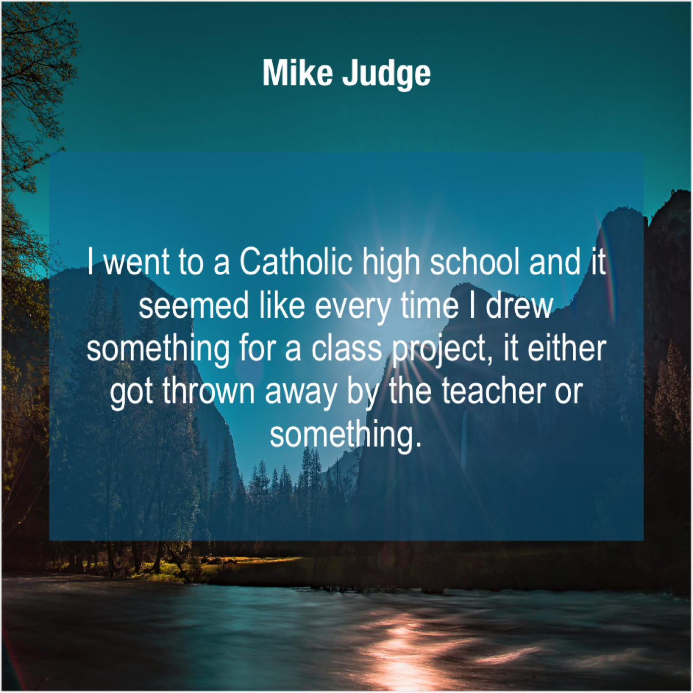 Mike Judge Mike Judge – I went to a Catholic… February 15, 2019 admin “I went to a Catholic high school and it seemed like every time I drew something for a class project, it either got thrown away by the teacher or something.”-Mike Judge