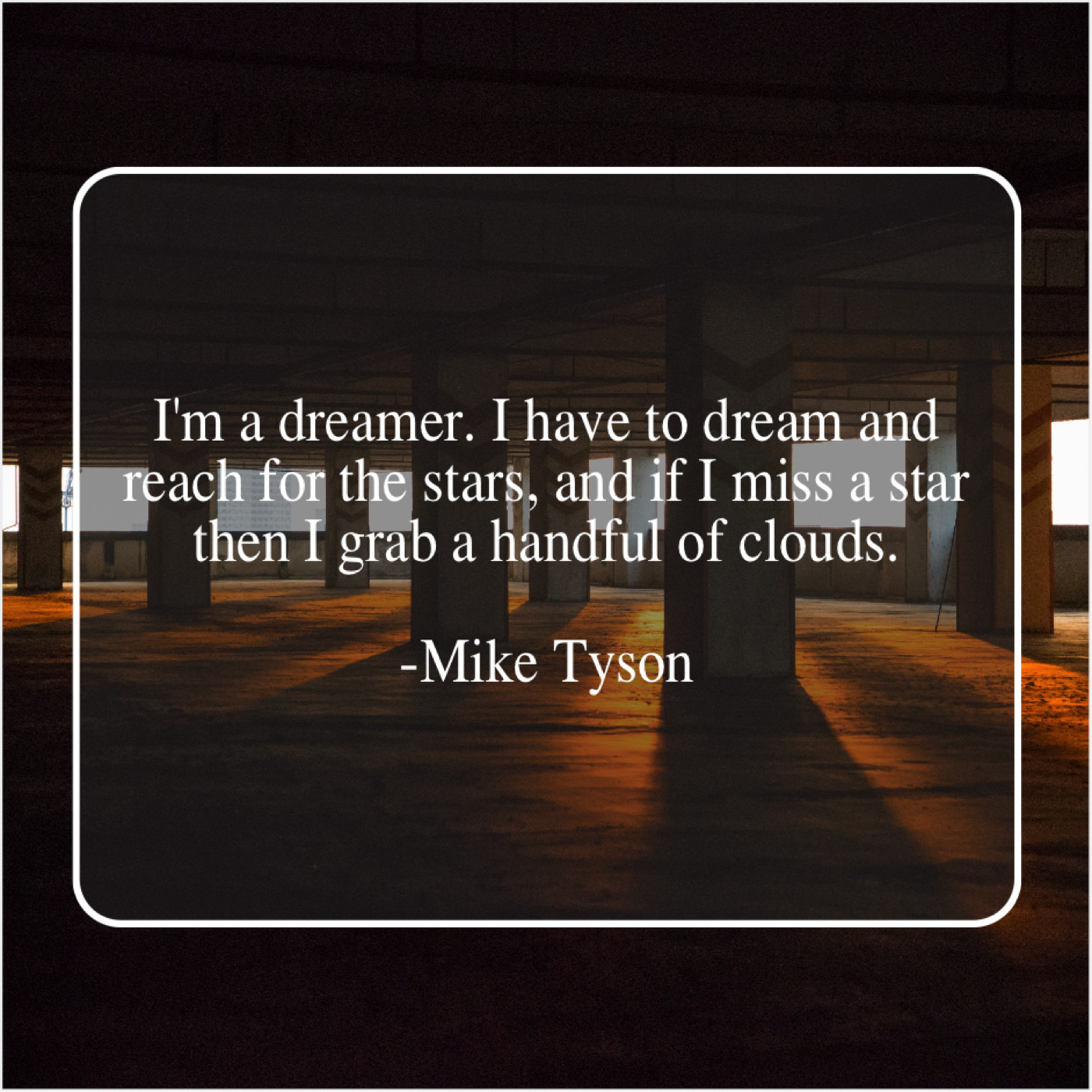 Mike Tyson Mike Tyson – I’m a dreamer. I have… August 6, 2019 admin “I’m a dreamer. I have to dream and reach for the stars, and if I miss a star then I grab a handful of clouds.”-Mike Tyson