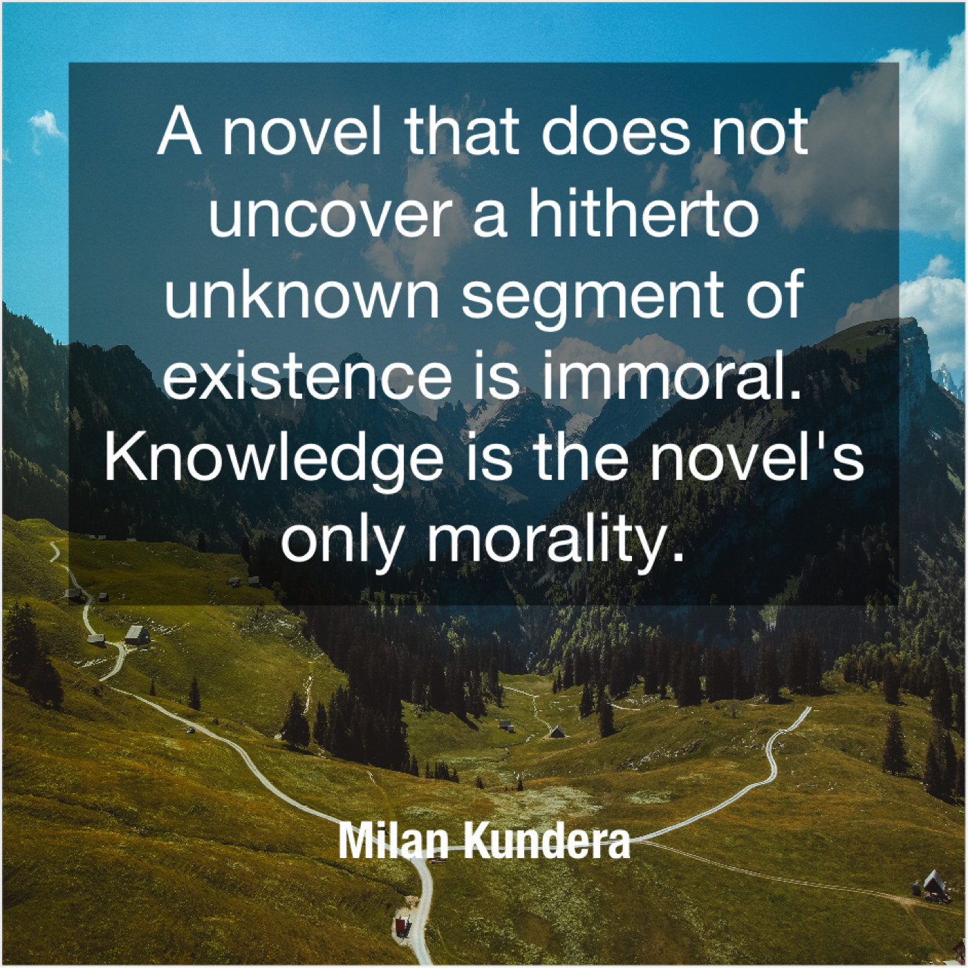 Milan Kundera Milan Kundera – A novel that does not… August 19, 2019 admin “A novel that does not uncover a hitherto unknown segment of existence is immoral. Knowledge is the novel’s only morality.”-Milan Kundera