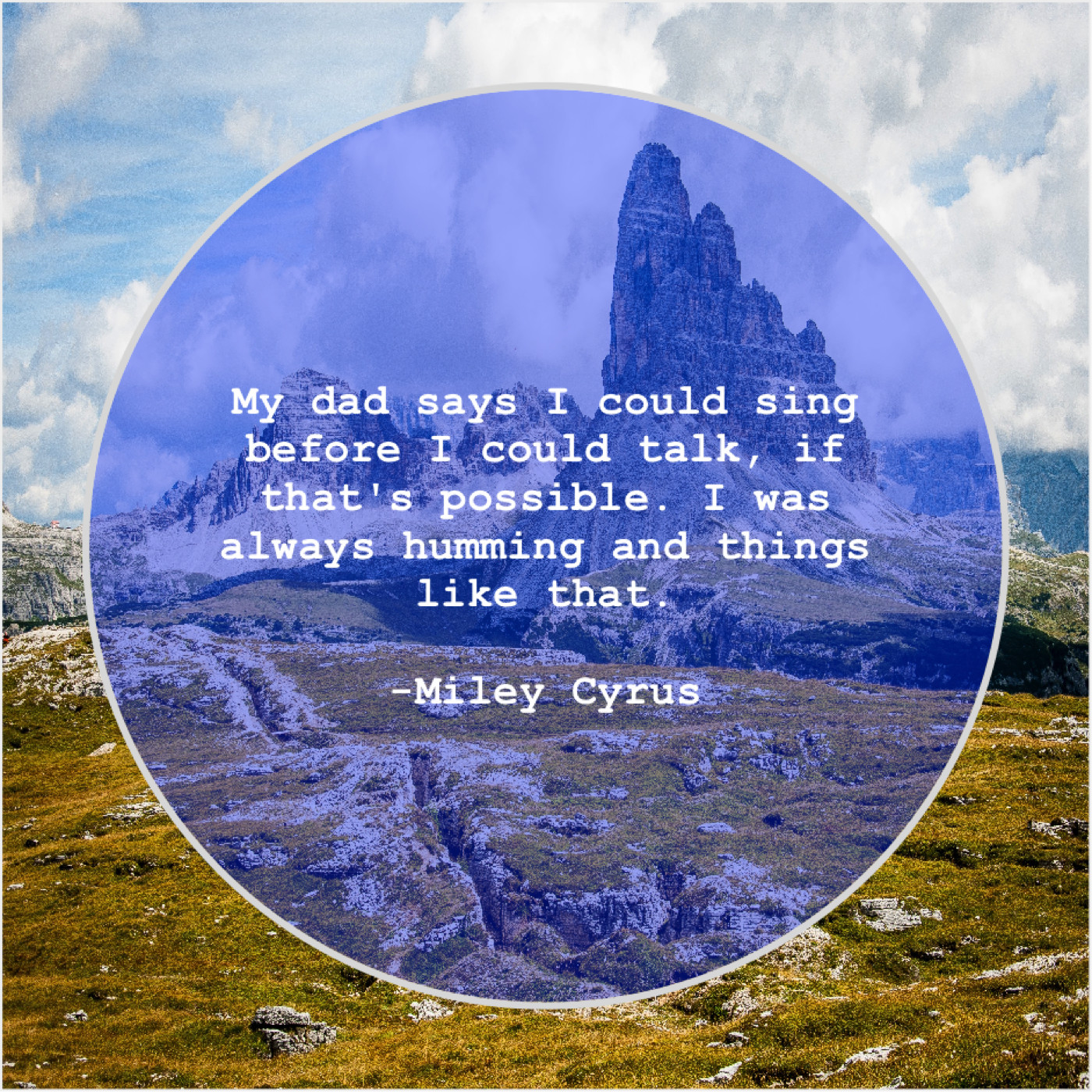 Miley Cyrus Miley Cyrus – My dad says I could… April 12, 2019 admin “My dad says I could sing before I could talk, if that’s possible. I was always humming and things like that.”-Miley Cyrus