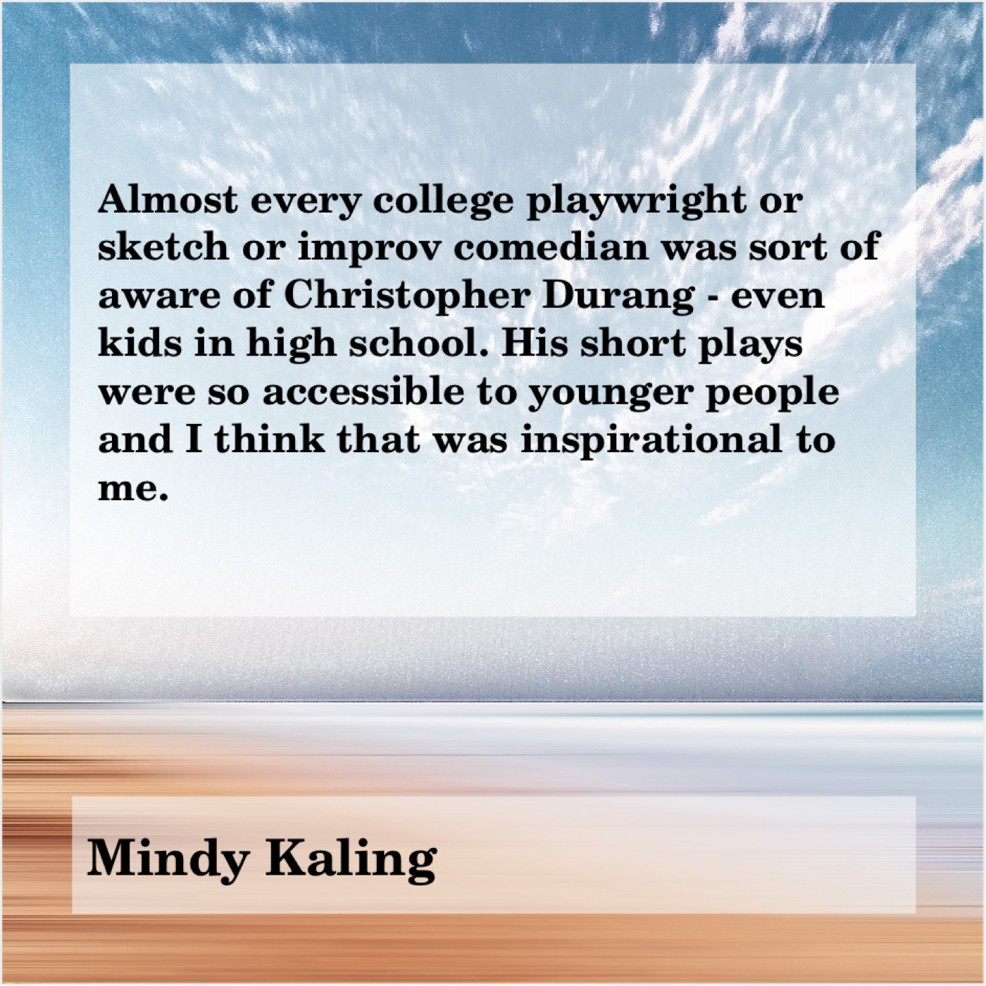 Mindy Kaling Mindy Kaling – Almost every college playwright or… August 15, 2019 admin “Almost every college playwright or sketch or improv comedian was sort of aware of Christopher Durang – even kids in high school. His short plays were so accessible to younger people and I think that was inspirational to me.”-Mindy Kaling
