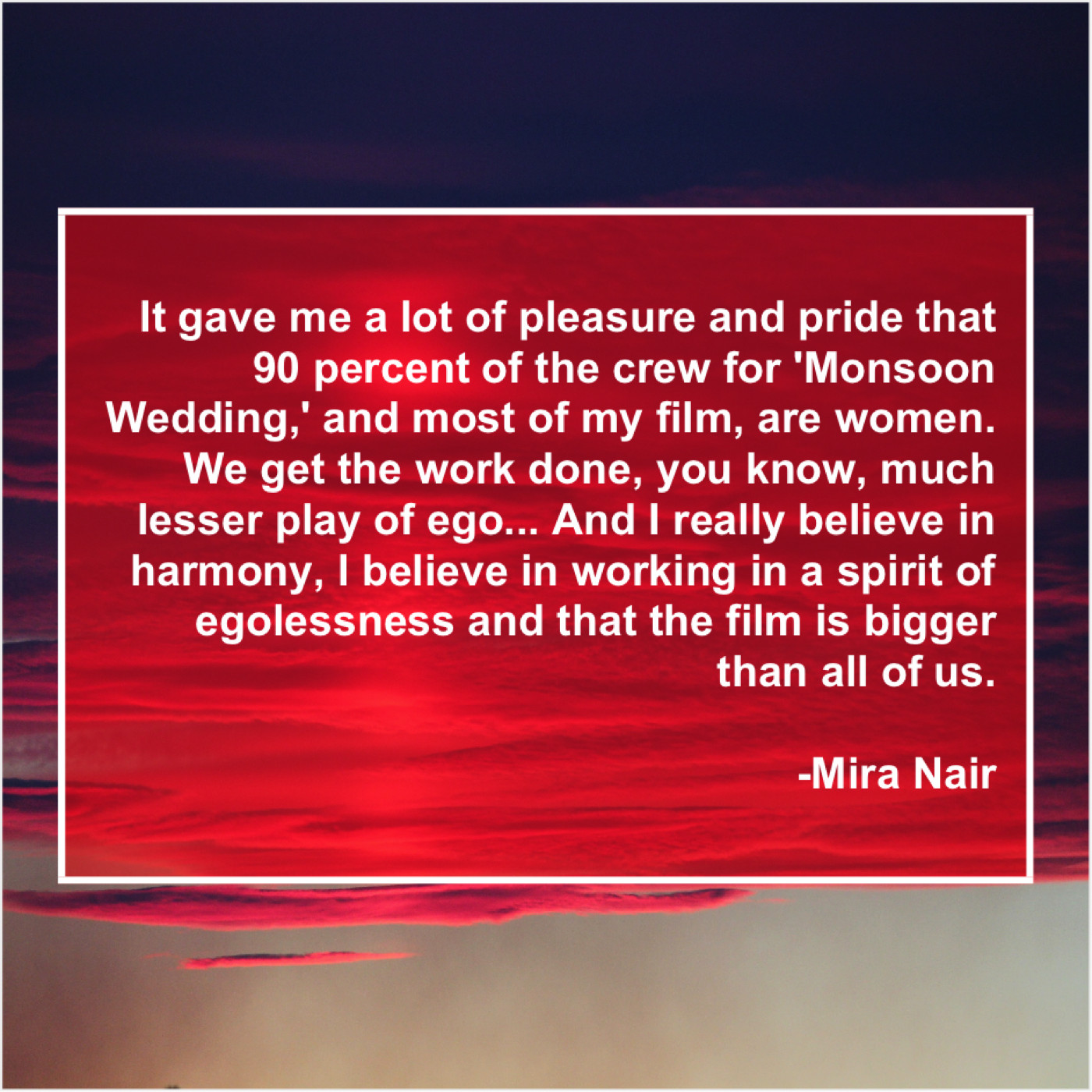 “It gave me a lot of pleasure and pride that 90 percent of the crew for ‘Monsoon Wedding,’ and most of my film, are women. We get the work done, you know, much lesser play of ego… And I really believe in harmony, I believe in working in a spirit of egolessness and that the film is bigger than all of us.”