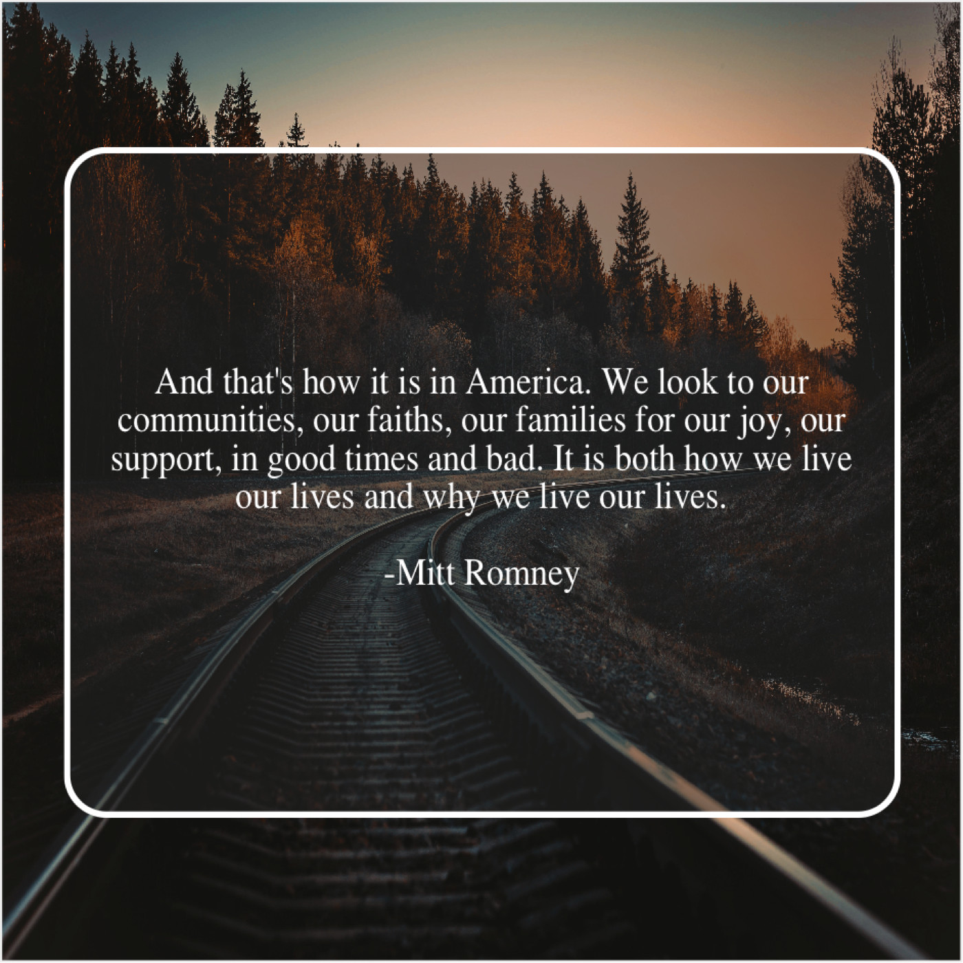 Mitt Romney Mitt Romney – And that’s how it is… December 18, 2018 admin “And that’s how it is in America. We look to our communities, our faiths, our families for our joy, our support, in good times and bad. It is both how we live our lives and why we live our lives.”-Mitt Romney