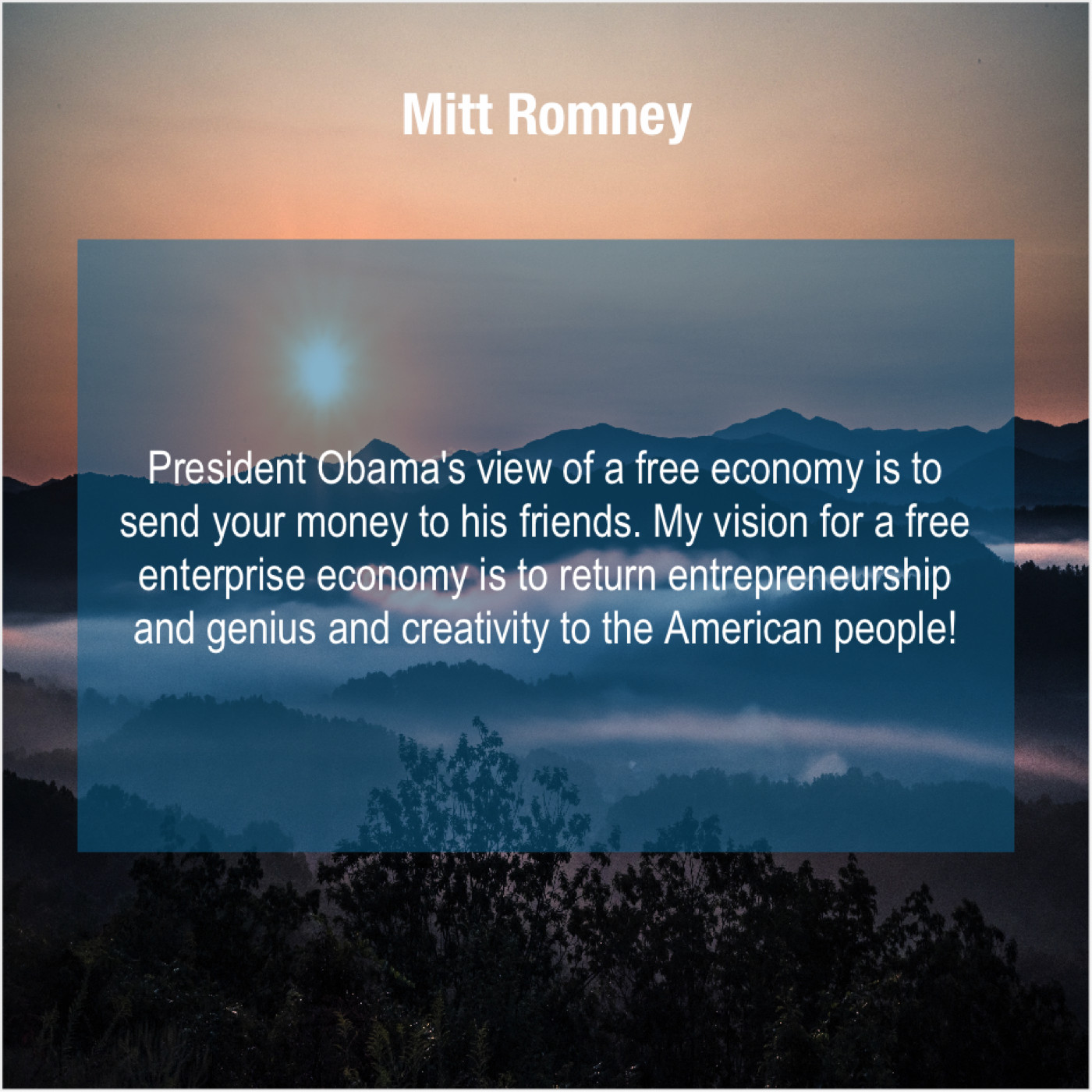 Mitt Romney Mitt Romney – President Obama’s view of a… March 1, 2019 admin “President Obama’s view of a free economy is to send your money to his friends. My vision for a free enterprise economy is to return entrepreneurship and genius and creativity to the American people!”-Mitt Romney