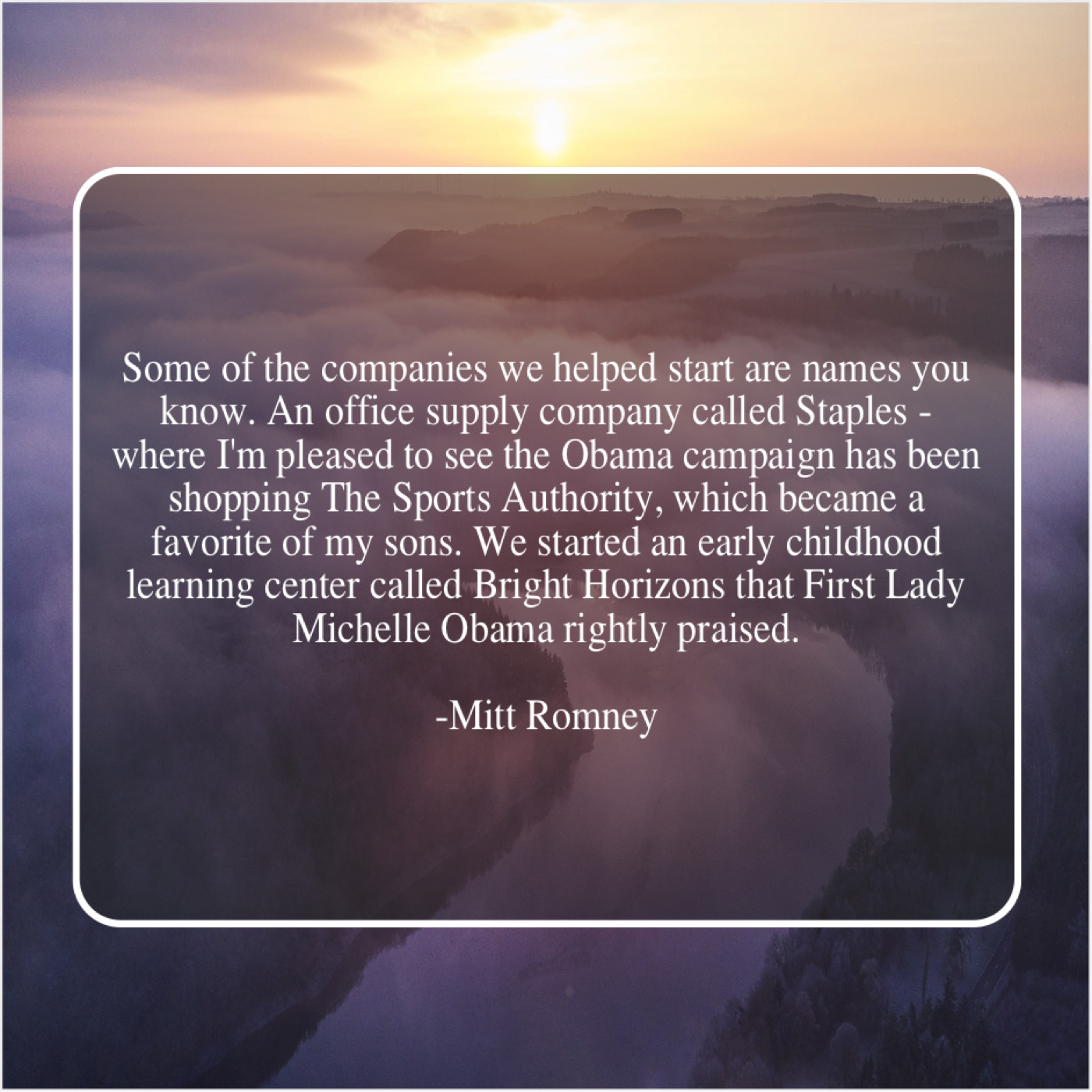 “Some of the companies we helped start are names you know. An office supply company called Staples – where I’m pleased to see the Obama campaign has been shopping The Sports Authority, which became a favorite of my sons. We started an early childhood learning center called Bright Horizons that First Lady Michelle Obama rightly praised.”