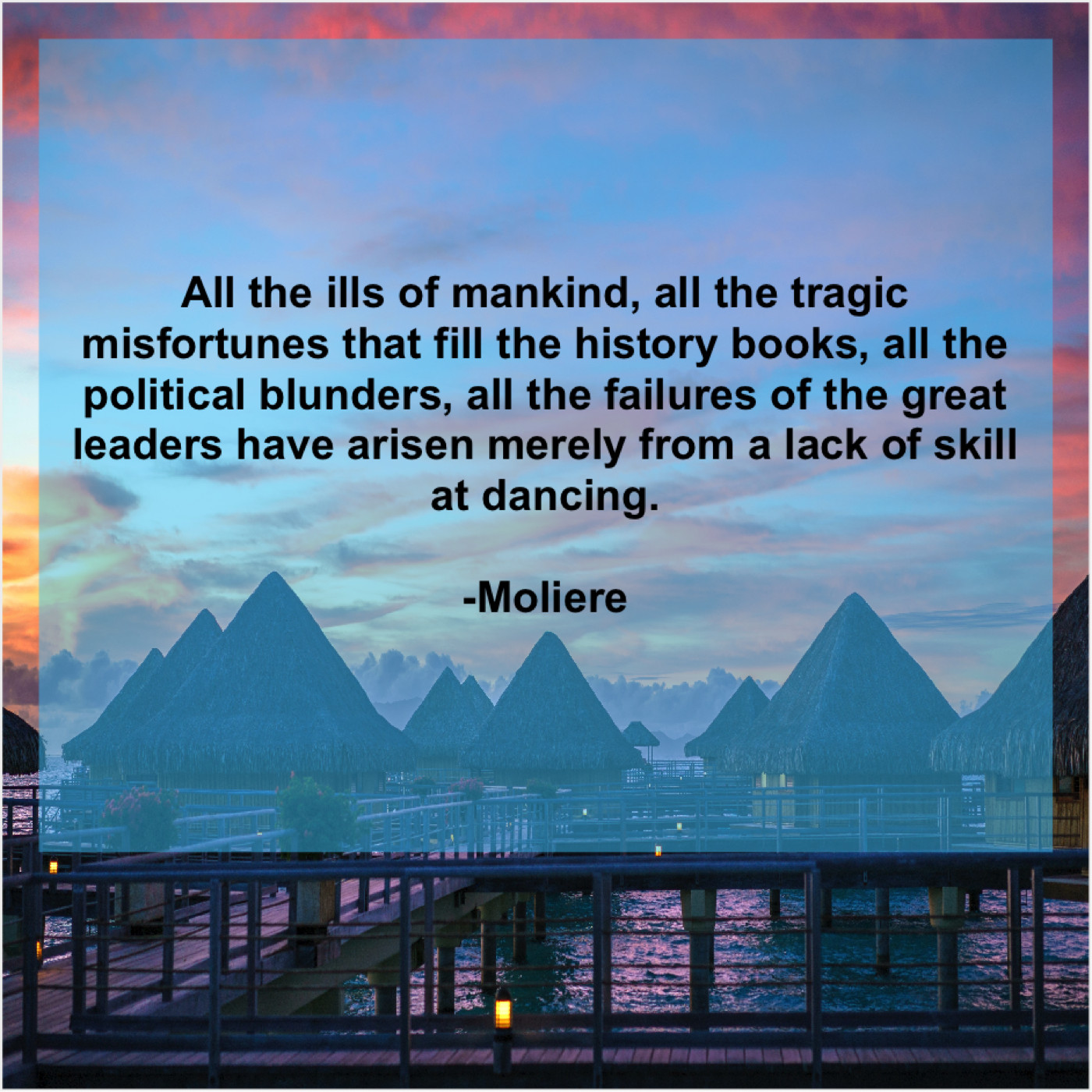 Moliere Moliere – All the ills of mankind… December 1, 2018 admin “All the ills of mankind, all the tragic misfortunes that fill the history books, all the political blunders, all the failures of the great leaders have arisen merely from a lack of skill at dancing.”-Moliere