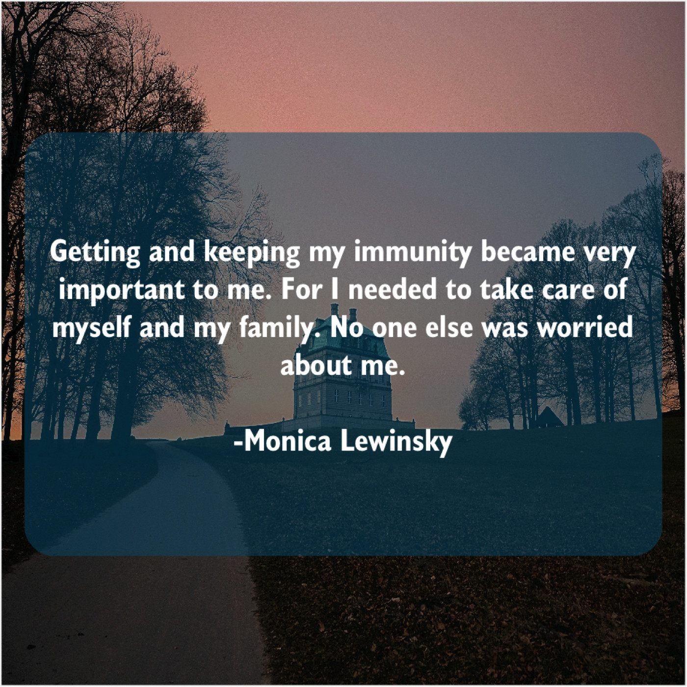 Monica Lewinsky Monica Lewinsky – Getting and keeping my immunity… April 7, 2019 admin “Getting and keeping my immunity became very important to me. For I needed to take care of myself and my family. No one else was worried about me.”-Monica Lewinsky