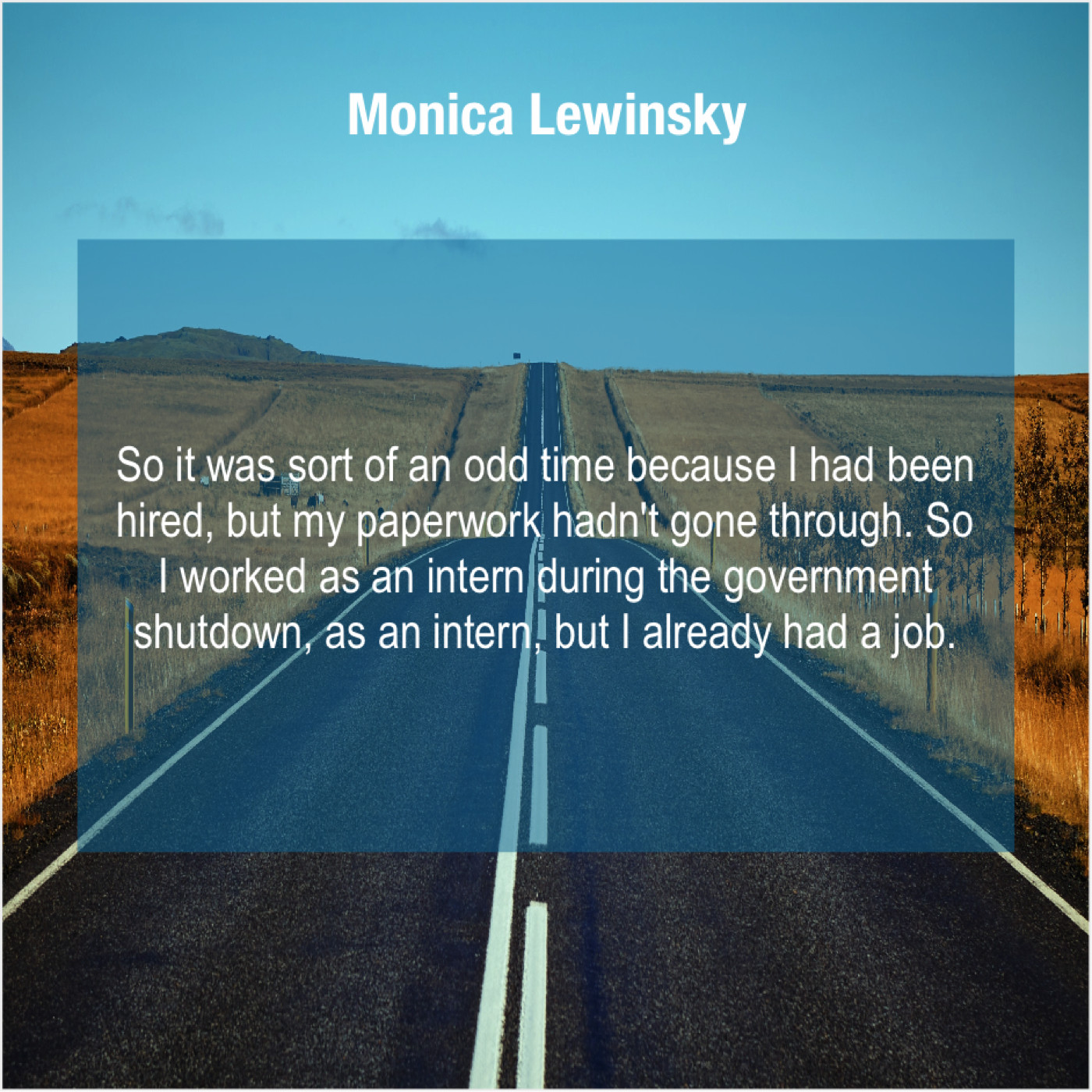 Monica Lewinsky Monica Lewinsky – So it was sort of… August 17, 2019 admin “So it was sort of an odd time because I had been hired, but my paperwork hadn’t gone through. So I worked as an intern during the government shutdown, as an intern, but I already had a job.”-Monica Lewinsky