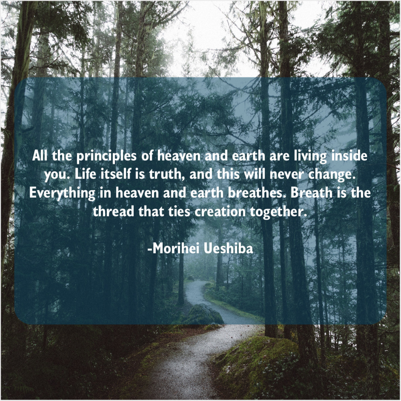 Morihei Ueshiba Morihei Ueshiba – All the principles of heaven… November 15, 2018 admin “All the principles of heaven and earth are living inside you. Life itself is truth, and this will never change. Everything in heaven and earth breathes. Breath is the thread that ties creation together.”-Morihei Ueshiba