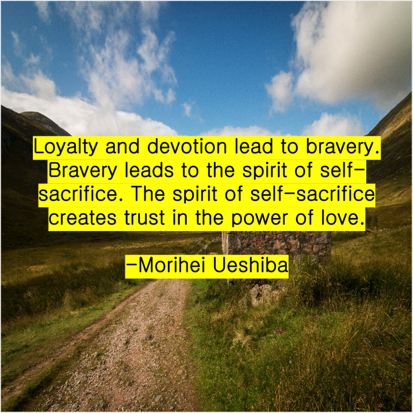 Morihei Ueshiba Morihei Ueshiba – Loyalty and devotion lead to… August 4, 2019 admin “Loyalty and devotion lead to bravery. Bravery leads to the spirit of self-sacrifice. The spirit of self-sacrifice creates trust in the power of love.”-Morihei Ueshiba