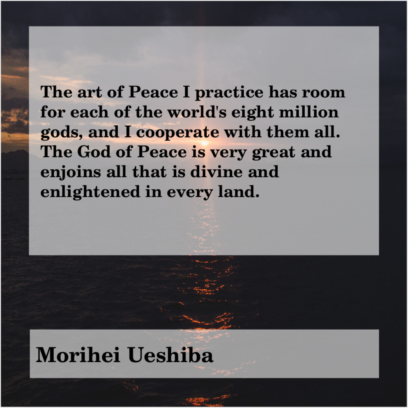 Morihei Ueshiba Morihei Ueshiba – The art of Peace I… March 19, 2019 admin “The art of Peace I practice has room for each of the world’s eight million gods, and I cooperate with them all. The God of Peace is very great and enjoins all that is divine and enlightened in every land.”-Morihei Ueshiba