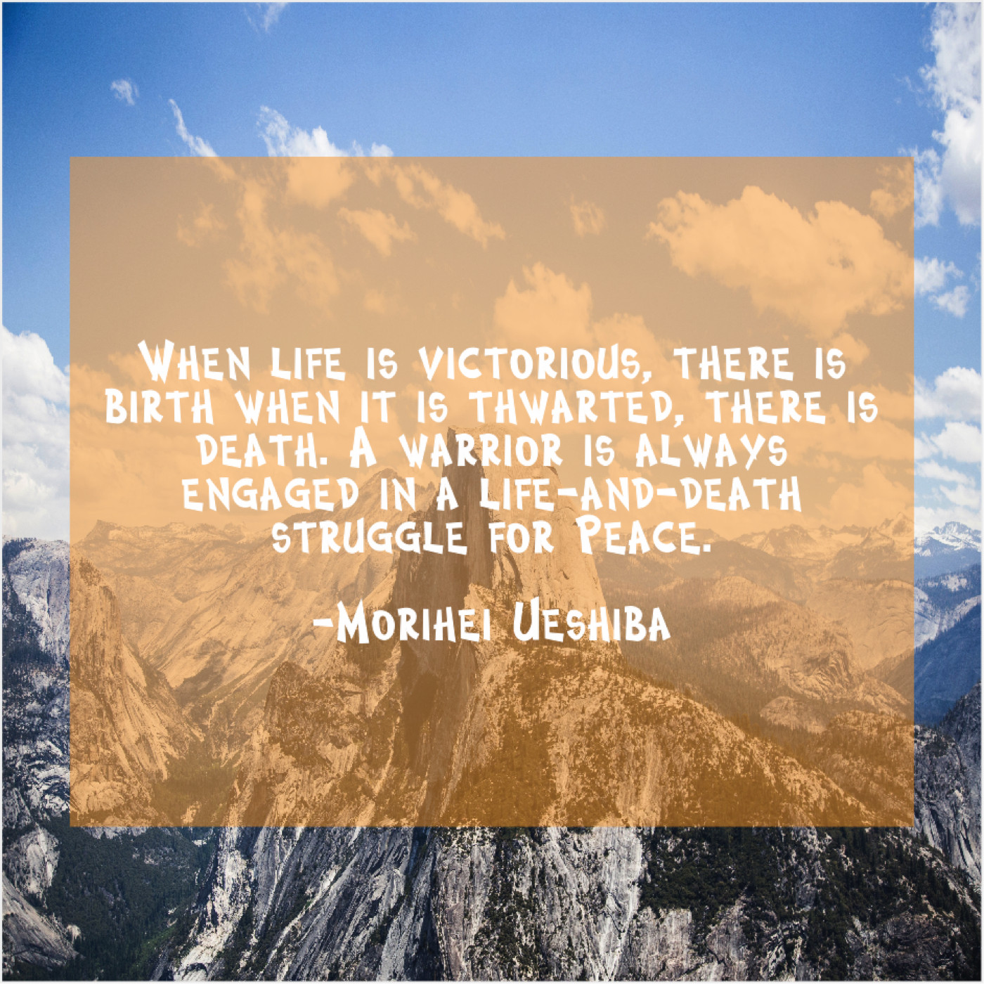 Morihei Ueshiba Morihei Ueshiba – When life is victorious, there… April 28, 2019 admin “When life is victorious, there is birth when it is thwarted, there is death. A warrior is always engaged in a life-and-death struggle for Peace.”-Morihei Ueshiba