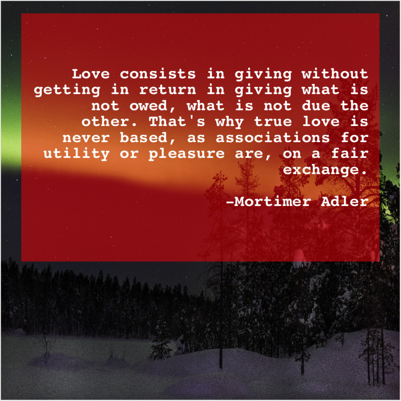 Mortimer Adler Mortimer Adler – Love consists in giving without… February 5, 2019 admin “Love consists in giving without getting in return in giving what is not owed, what is not due the other. That’s why true love is never based, as associations for utility or pleasure are, on a fair exchange.”-Mortimer Adler