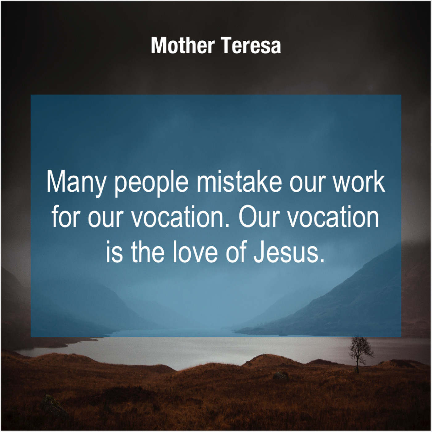 Mother Teresa Mother Teresa – Many people mistake our work… February 17, 2019 admin “Many people mistake our work for our vocation. Our vocation is the love of Jesus.”-Mother Teresa