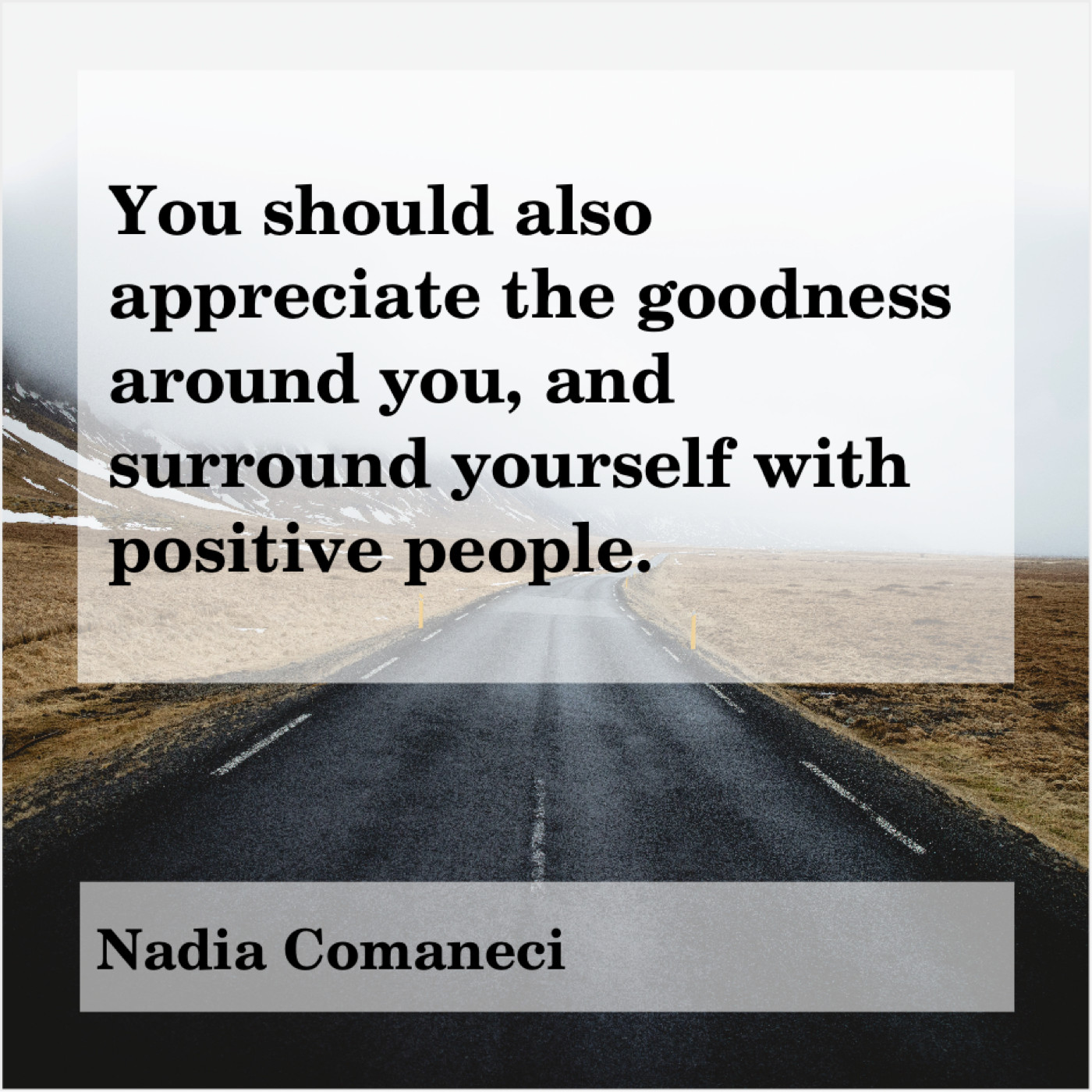 Nadia Comaneci Nadia Comaneci – You should also appreciate the… October 17, 2019 admin “You should also appreciate the goodness around you, and surround yourself with positive people.”-Nadia Comaneci