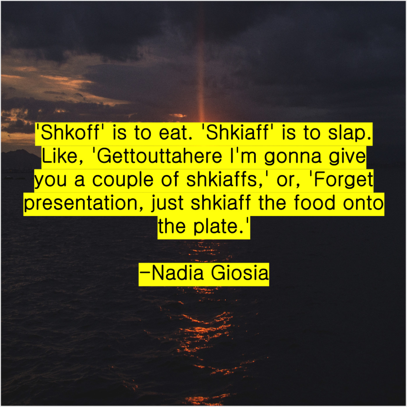 Nadia Giosia Nadia Giosia – Shkoff’ is to eat. ‘Shkiaff… July 5, 2019 admin “‘Shkoff’ is to eat. ‘Shkiaff’ is to slap. Like, ‘Gettouttahere I’m gonna give you a couple of shkiaffs,’ or, ‘Forget presentation, just shkiaff the food onto the plate.'”-Nadia Giosia