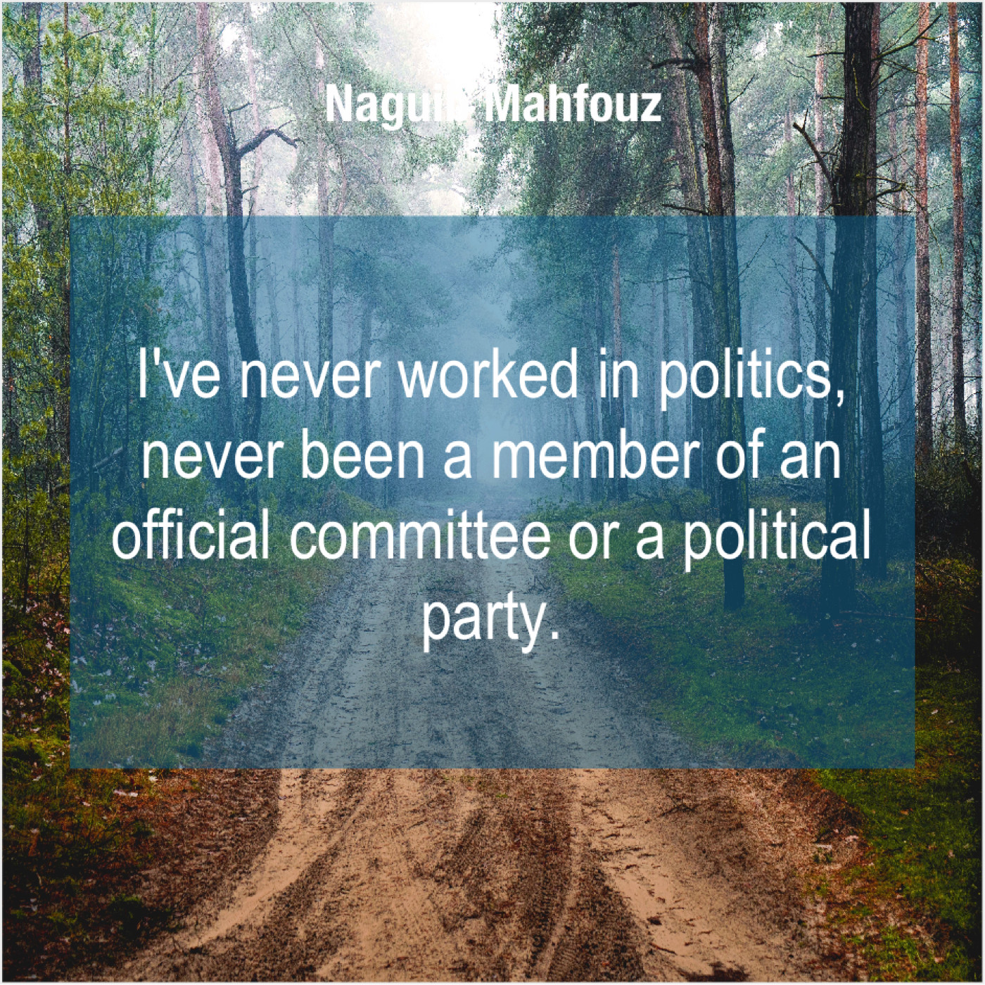 Naguib Mahfouz Naguib Mahfouz – I’ve never worked in politics… August 1, 2019 admin “I’ve never worked in politics, never been a member of an official committee or a political party.”-Naguib Mahfouz