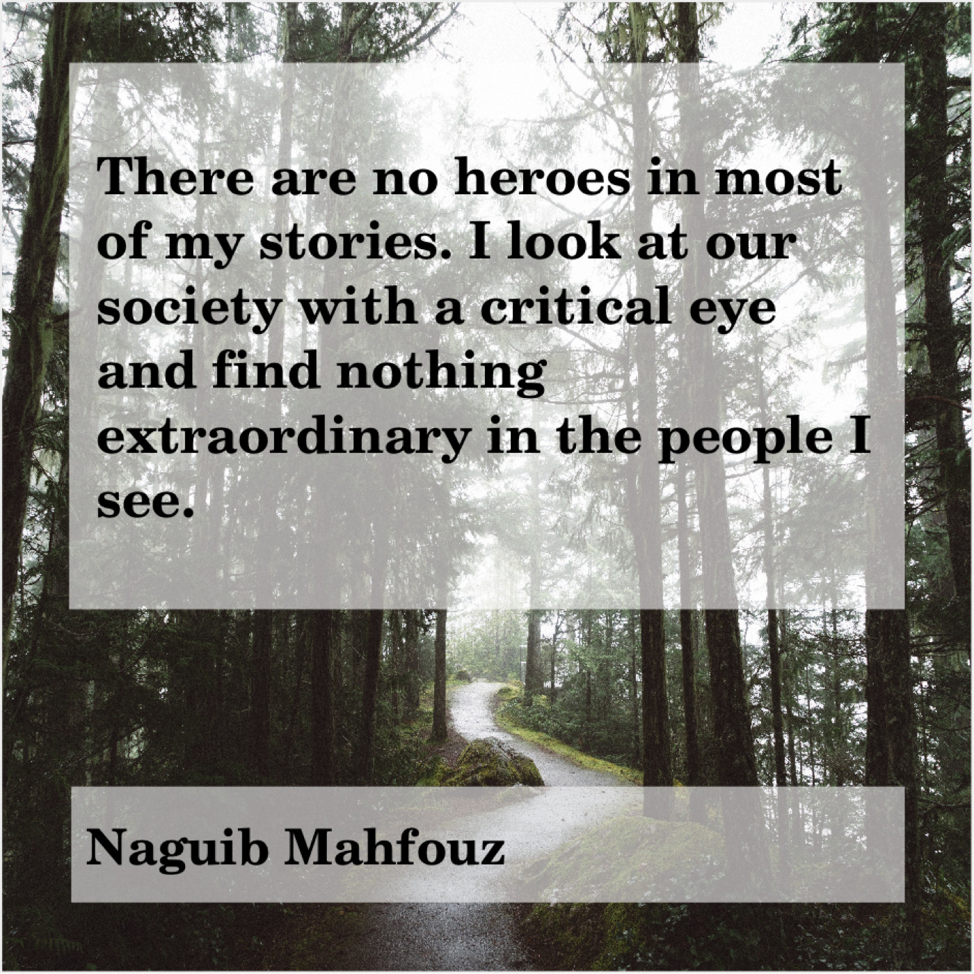 Naguib Mahfouz Naguib Mahfouz – There are no heroes in… July 30, 2019 admin “There are no heroes in most of my stories. I look at our society with a critical eye and find nothing extraordinary in the people I see.”-Naguib Mahfouz
