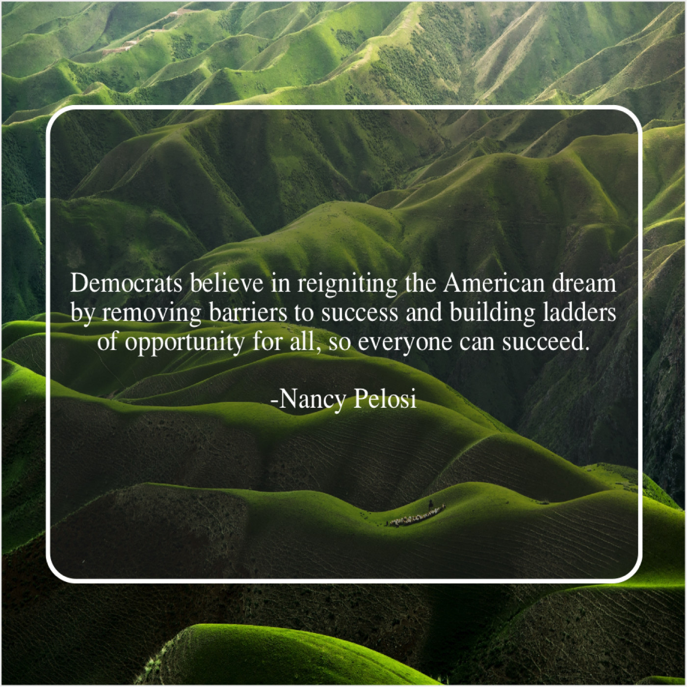 Nancy Pelosi Nancy Pelosi – Democrats believe in reigniting the… September 17, 2019 admin “Democrats believe in reigniting the American dream by removing barriers to success and building ladders of opportunity for all, so everyone can succeed.”-Nancy Pelosi