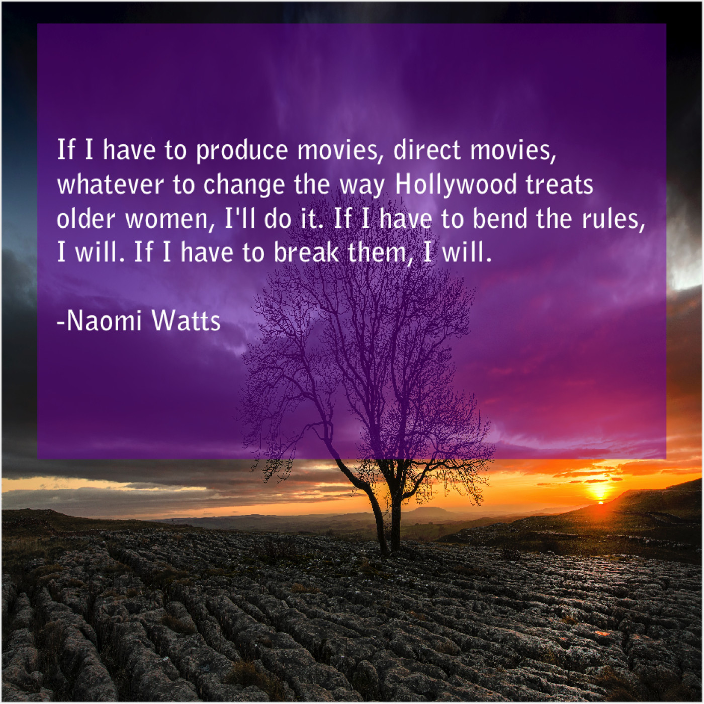 Naomi Watts Naomi Watts – If I have to produce… November 17, 2018 admin “If I have to produce movies, direct movies, whatever to change the way Hollywood treats older women, I’ll do it. If I have to bend the rules, I will. If I have to break them, I will.”-Naomi Watts