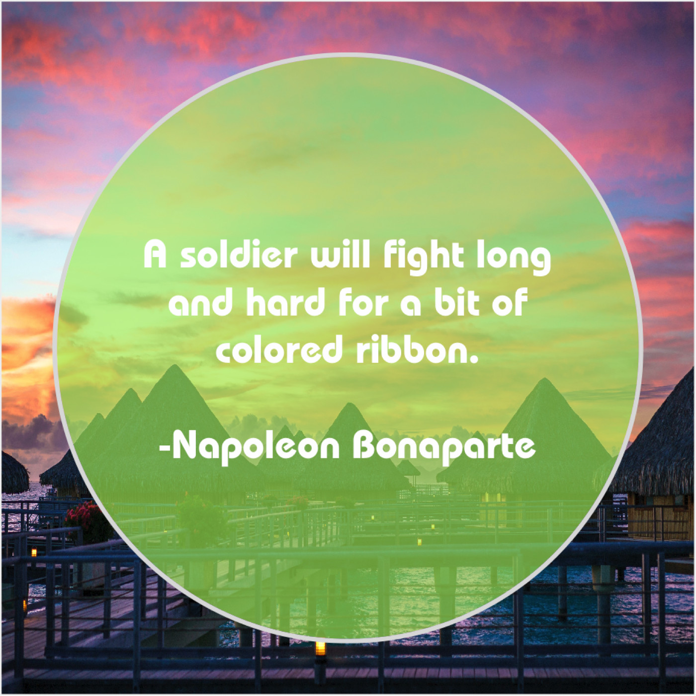 Napoleon Bonaparte Napoleon Bonaparte – A soldier will fight long… November 20, 2018 admin “A soldier will fight long and hard for a bit of colored ribbon.”-Napoleon Bonaparte