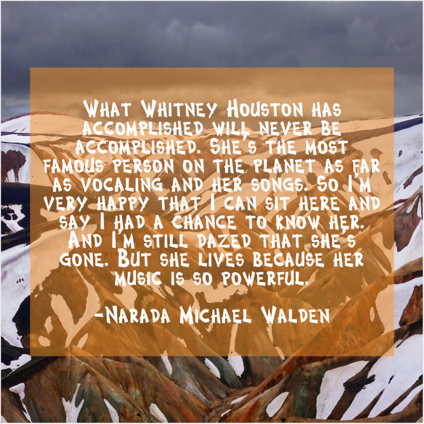 “What Whitney Houston has accomplished will never be accomplished. She’s the most famous person on the planet as far as vocaling and her songs. So I’m very happy that I can sit here and say I had a chance to know her. And I’m still dazed that she’s gone. But she lives because her music is so powerful.”