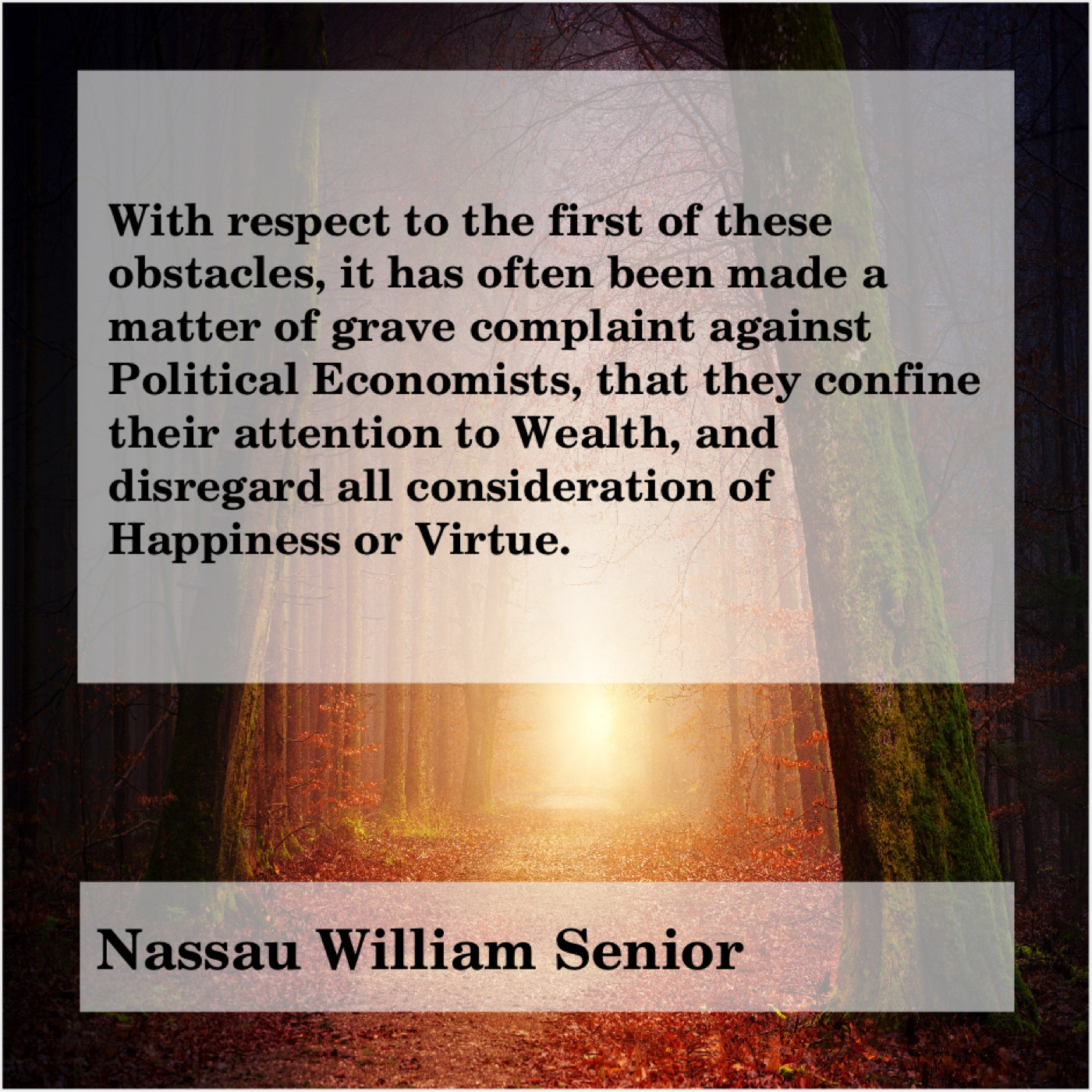 “With respect to the first of these obstacles, it has often been made a matter of grave complaint against Political Economists, that they confine their attention to Wealth, and disregard all consideration of Happiness or Virtue.”