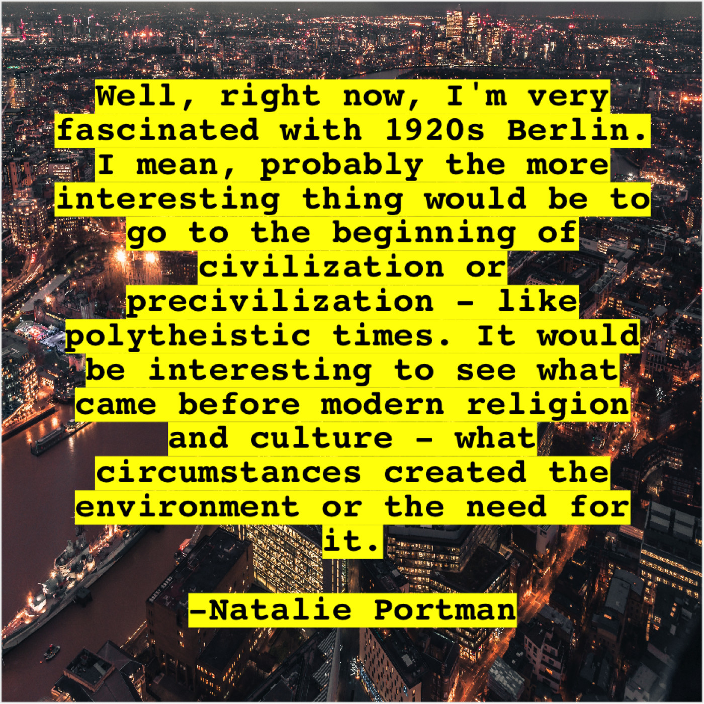 “Well, right now, I’m very fascinated with 1920s Berlin. I mean, probably the more interesting thing would be to go to the beginning of civilization or precivilization – like polytheistic times. It would be interesting to see what came before modern religion and culture – what circumstances created the environment or the need for it.”
