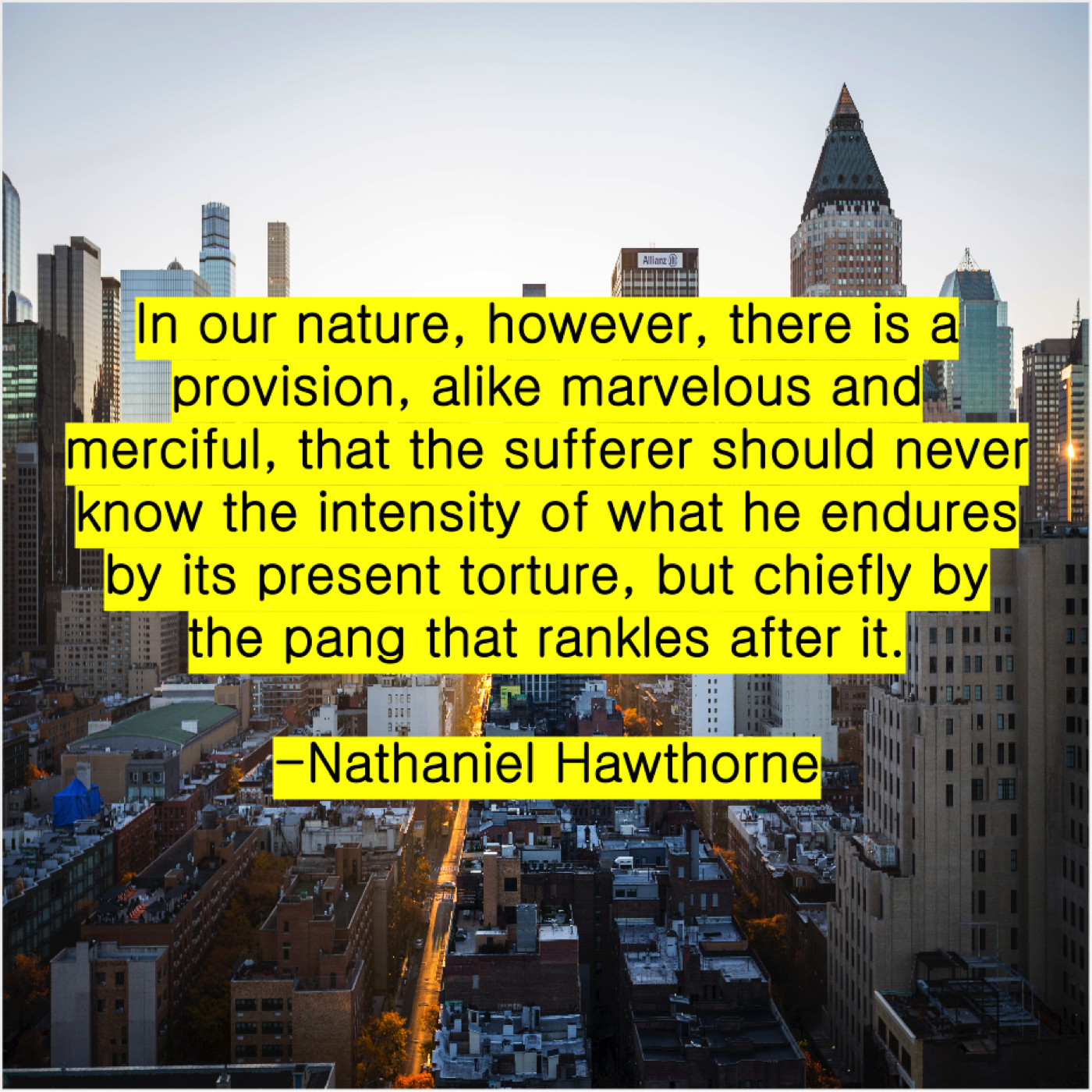 Nathaniel Hawthorne Nathaniel Hawthorne – In our nature, however, there… July 7, 2019 admin “In our nature, however, there is a provision, alike marvelous and merciful, that the sufferer should never know the intensity of what he endures by its present torture, but chiefly by the pang that rankles after it.”-Nathaniel Hawthorne