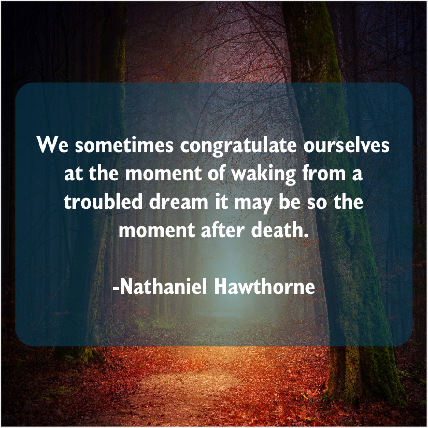 Nathaniel Hawthorne Nathaniel Hawthorne – We sometimes congratulate ourselves at… June 2, 2019 admin “We sometimes congratulate ourselves at the moment of waking from a troubled dream it may be so the moment after death.”-Nathaniel Hawthorne