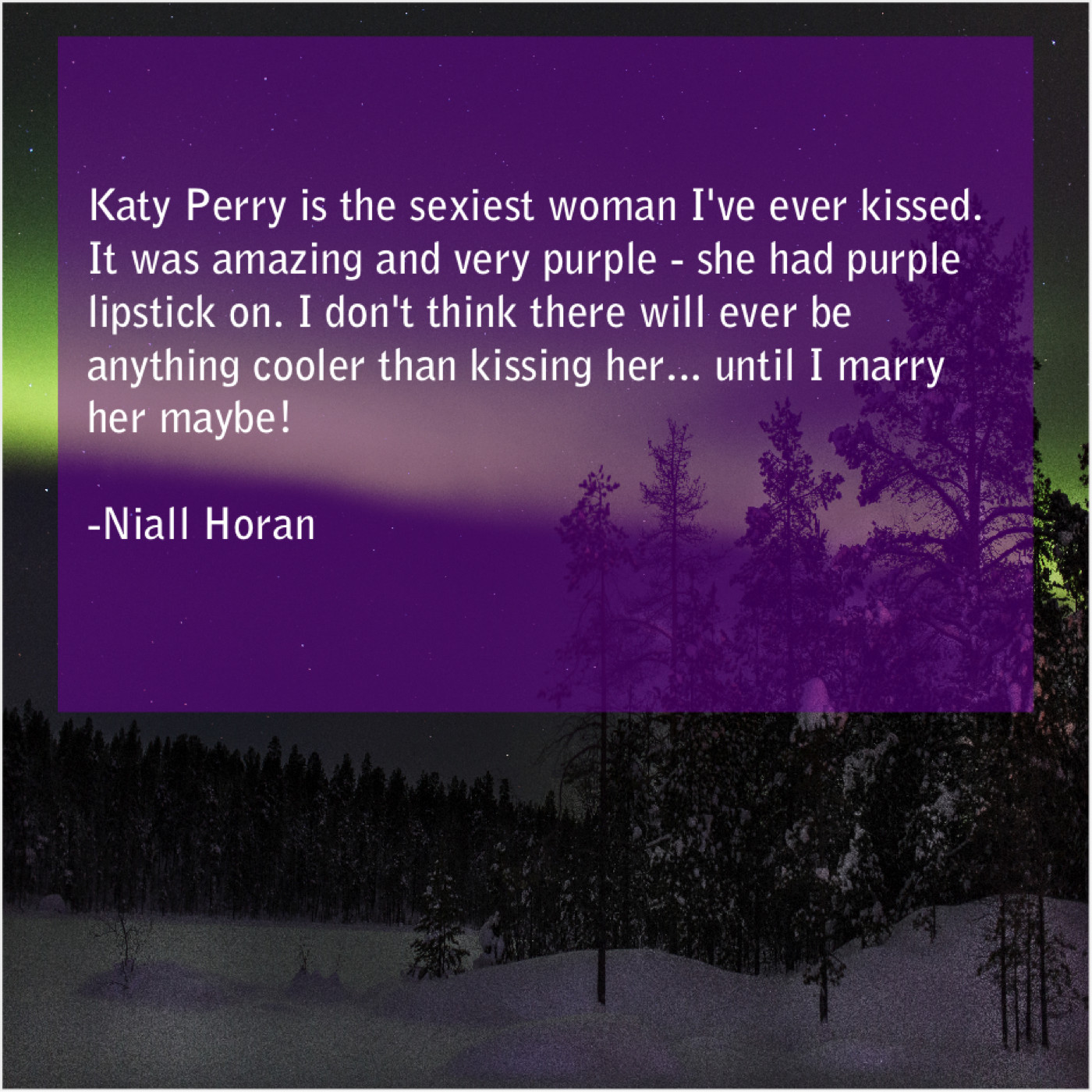 Niall Horan Niall Horan – Katy Perry is the sexiest… November 8, 2018 admin “Katy Perry is the sexiest woman I’ve ever kissed. It was amazing and very purple – she had purple lipstick on. I don’t think there will ever be anything cooler than kissing her… until I marry her maybe!”-Niall Horan