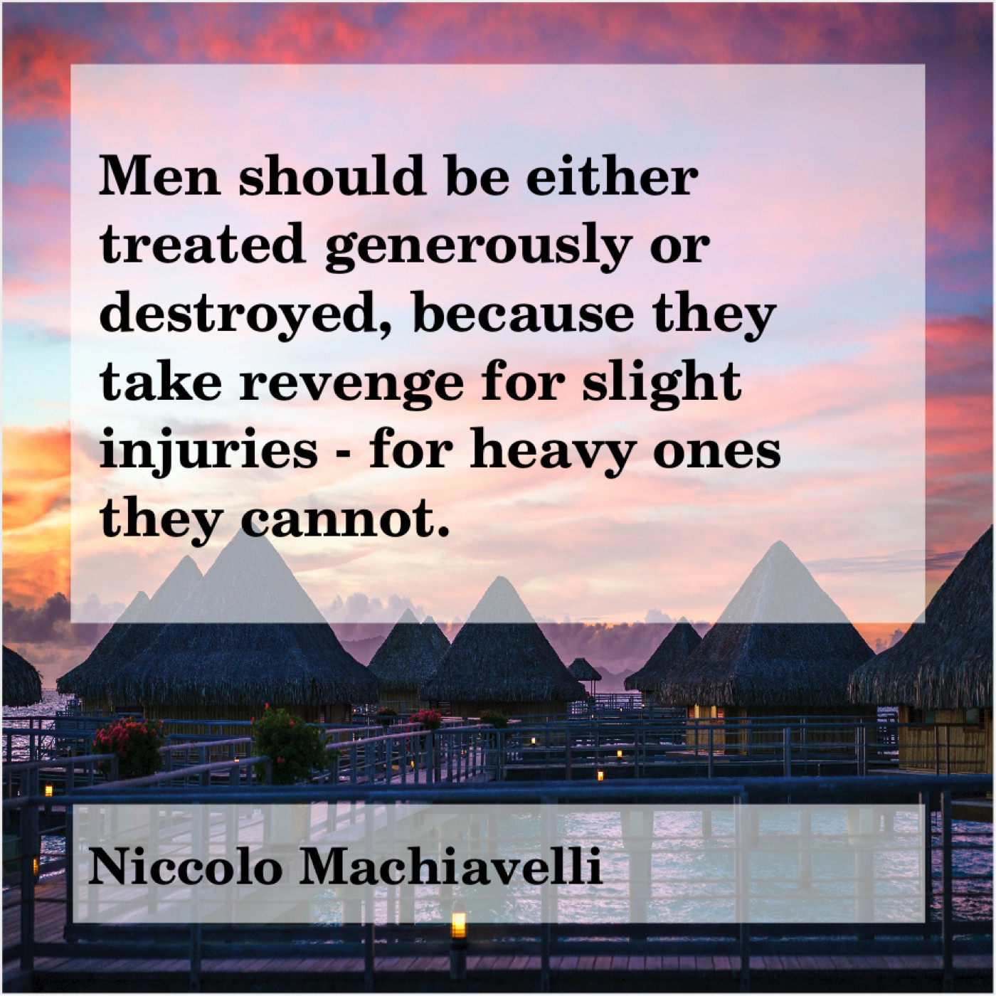 Niccolo Machiavelli Niccolo Machiavelli – Men should be either treated… August 19, 2019 admin “Men should be either treated generously or destroyed, because they take revenge for slight injuries – for heavy ones they cannot.”-Niccolo Machiavelli