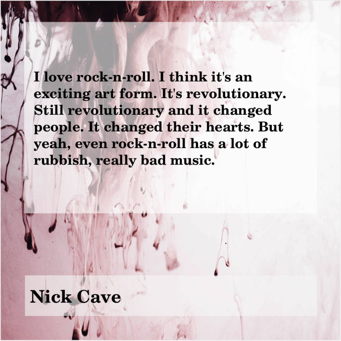 Nick Cave Nick Cave – I love rock-n-roll… December 23, 2018 admin “I love rock-n-roll. I think it’s an exciting art form. It’s revolutionary. Still revolutionary and it changed people. It changed their hearts. But yeah, even rock-n-roll has a lot of rubbish, really bad music.”-Nick Cave