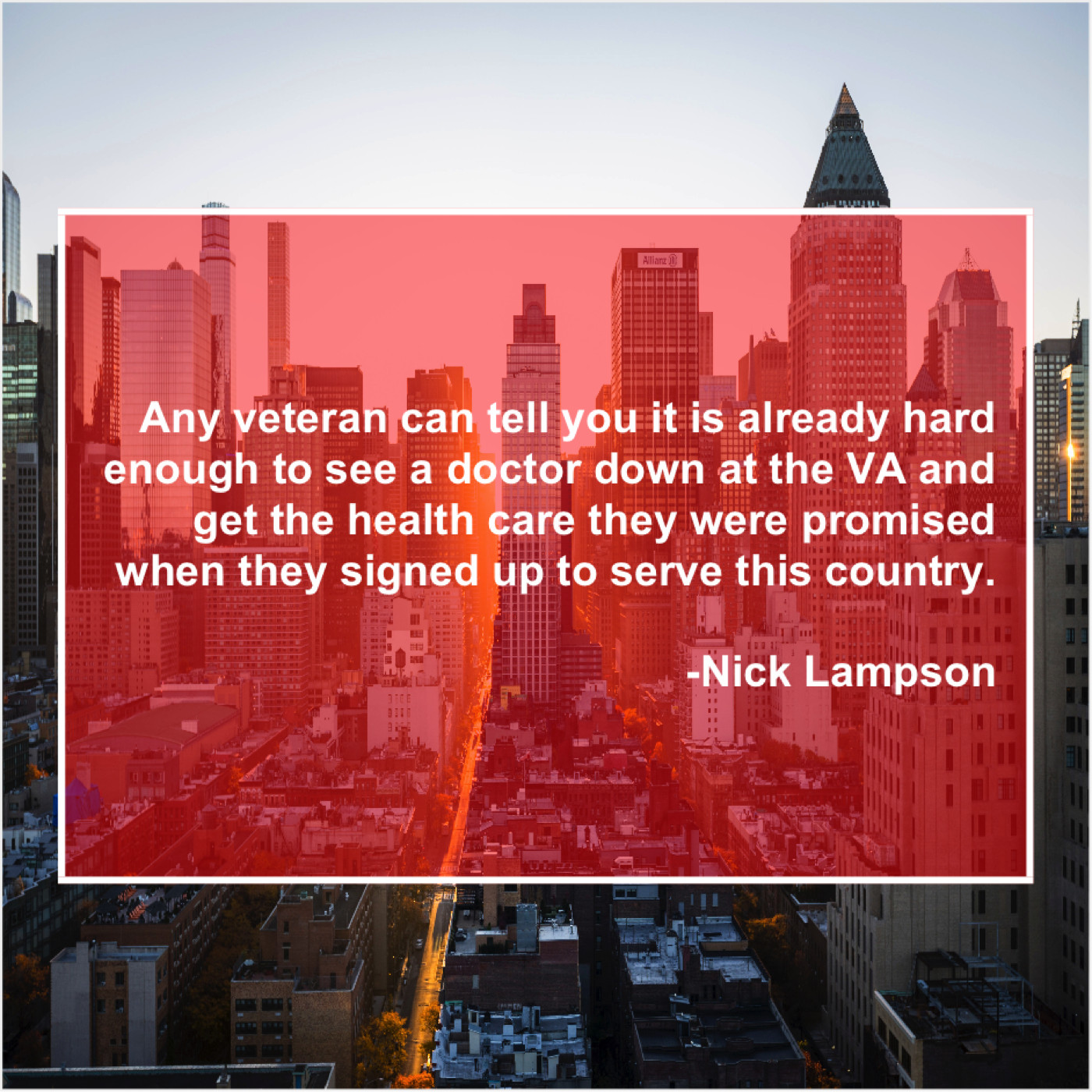 Nick Lampson Nick Lampson – Any veteran can tell you… September 14, 2019 admin “Any veteran can tell you it is already hard enough to see a doctor down at the VA and get the health care they were promised when they signed up to serve this country.”-Nick Lampson
