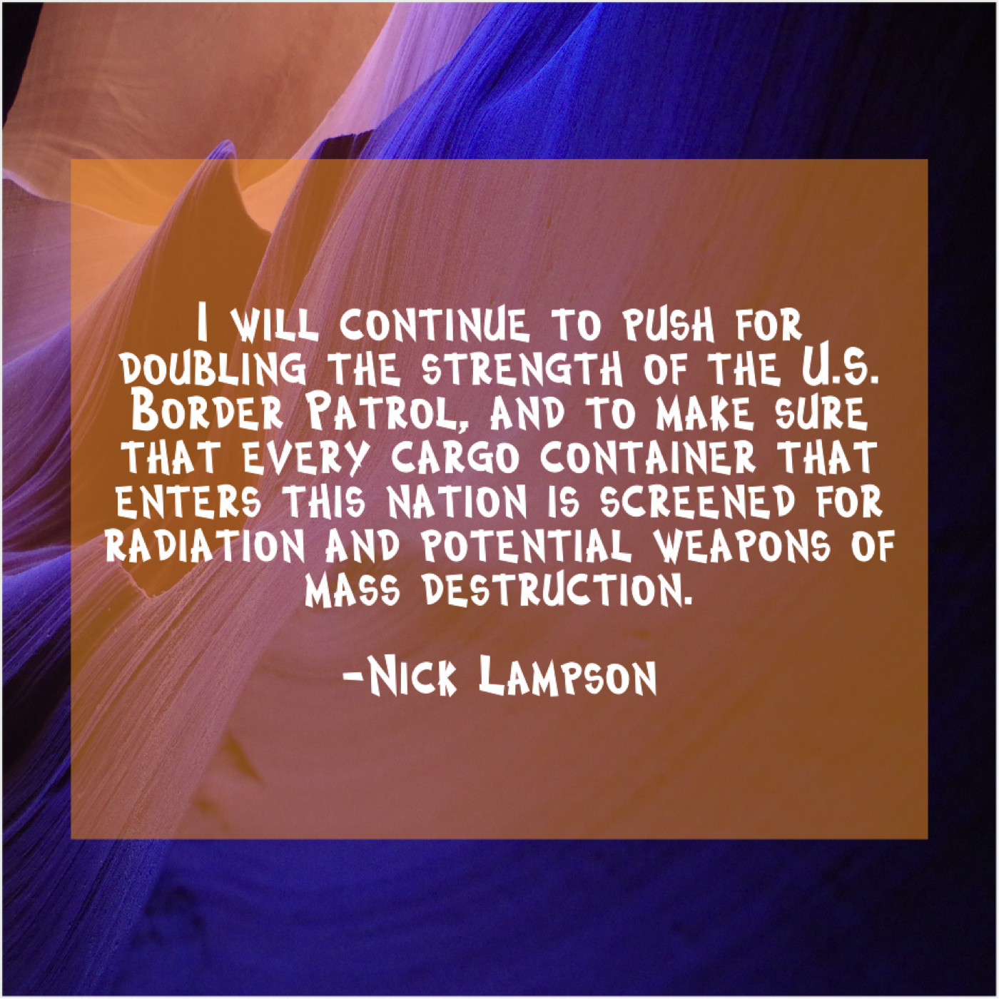 Nick Lampson Nick Lampson – I will continue to push… March 31, 2019 admin “I will continue to push for doubling the strength of the U.S. Border Patrol, and to make sure that every cargo container that enters this nation is screened for radiation and potential weapons of mass destruction.”-Nick Lampson