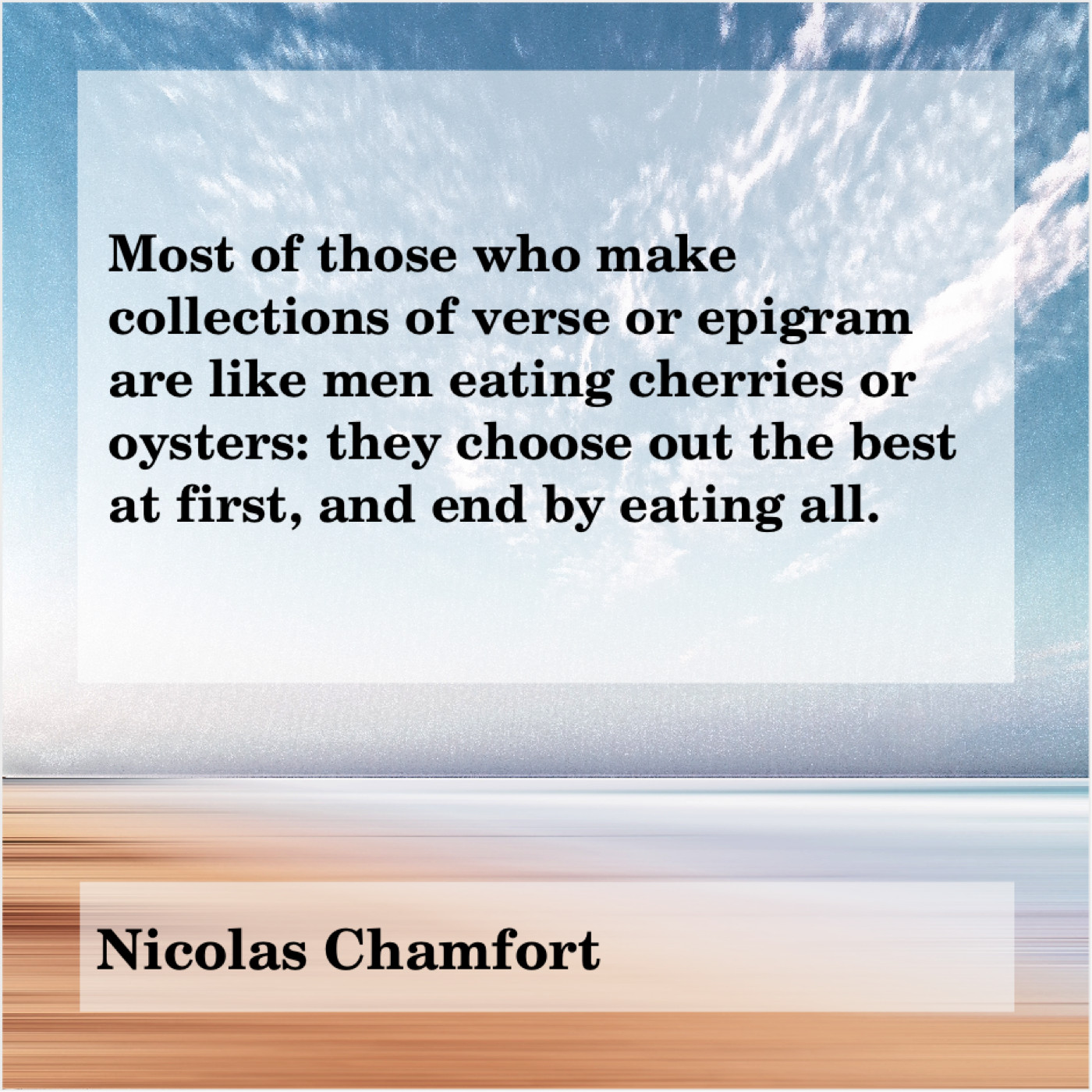 Nicolas Chamfort Nicolas Chamfort – Most of those who make… November 10, 2018 admin “Most of those who make collections of verse or epigram are like men eating cherries or oysters: they choose out the best at first, and end by eating all.”-Nicolas Chamfort