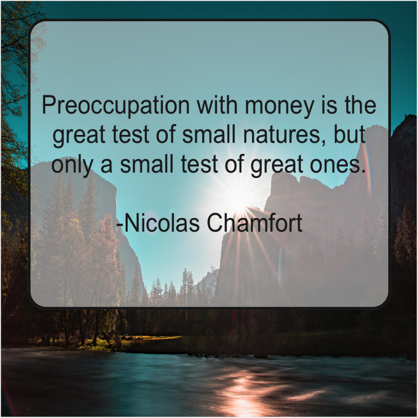 Nicolas Chamfort Nicolas Chamfort – Preoccupation with money is the… April 14, 2019 admin “Preoccupation with money is the great test of small natures, but only a small test of great ones.”-Nicolas Chamfort