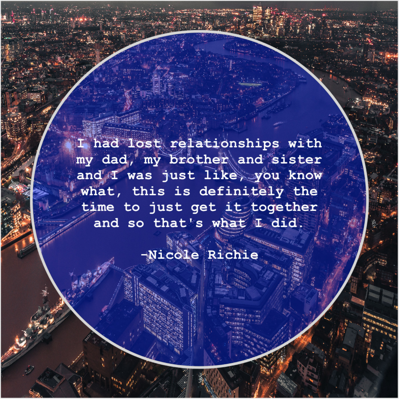 Nicole Richie Nicole Richie – I had lost relationships with… April 12, 2019 admin “I had lost relationships with my dad, my brother and sister and I was just like, you know what, this is definitely the time to just get it together and so that’s what I did.”-Nicole Richie