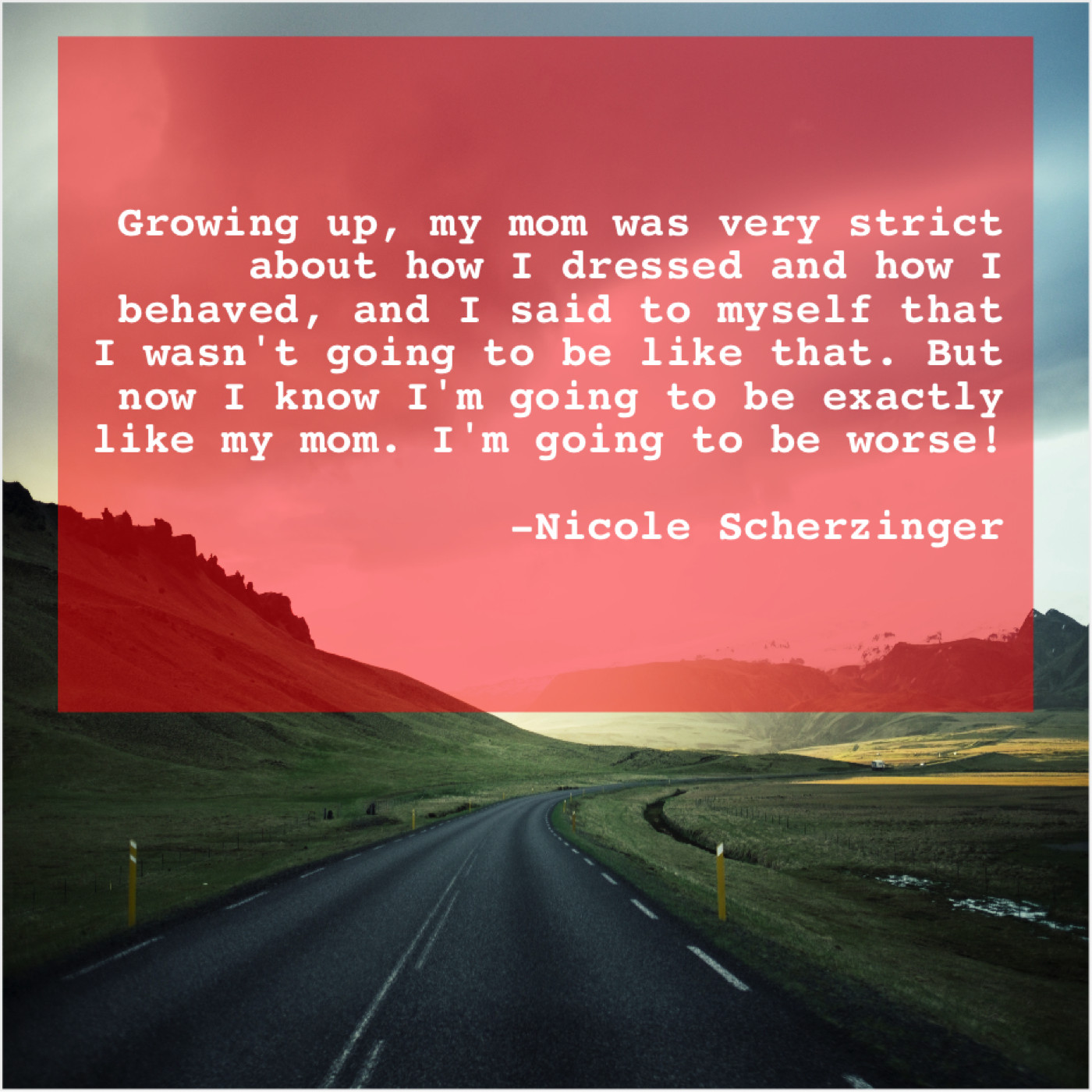 “Growing up, my mom was very strict about how I dressed and how I behaved, and I said to myself that I wasn’t going to be like that. But now I know I’m going to be exactly like my mom. I’m going to be worse!”