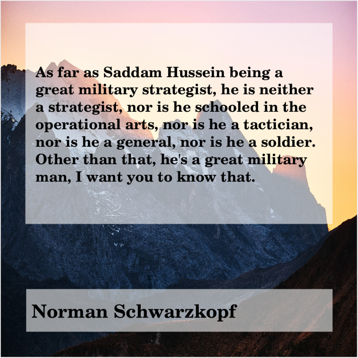 “As far as Saddam Hussein being a great military strategist, he is neither a strategist, nor is he schooled in the operational arts, nor is he a tactician, nor is he a general, nor is he a soldier. Other than that, he’s a great military man, I want you to know that.”