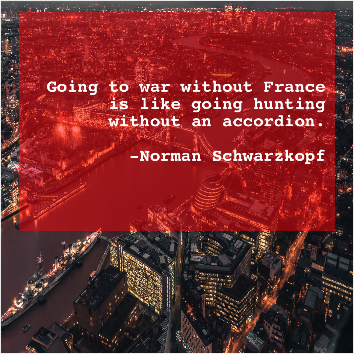 Norman Schwarzkopf Norman Schwarzkopf – Going to war without France… February 28, 2019 admin “Going to war without France is like going hunting without an accordion.”-Norman Schwarzkopf