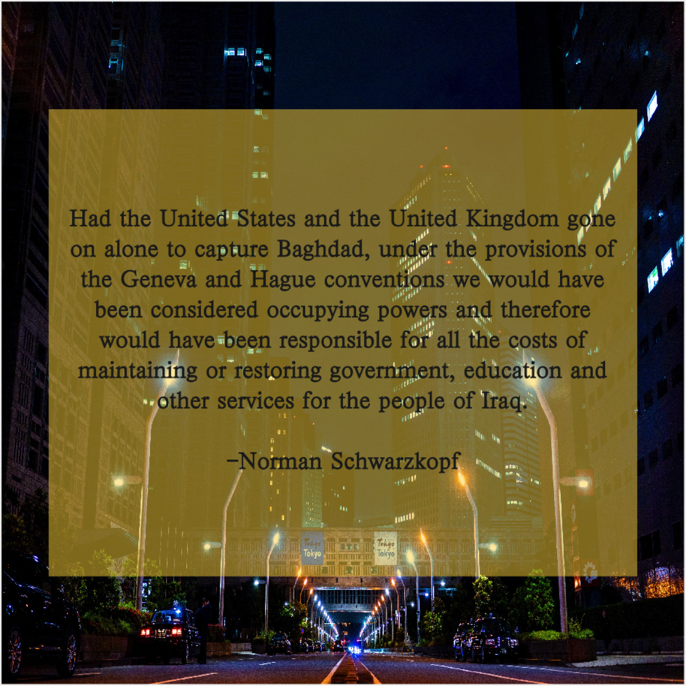 “Had the United States and the United Kingdom gone on alone to capture Baghdad, under the provisions of the Geneva and Hague conventions we would have been considered occupying powers and therefore would have been responsible for all the costs of maintaining or restoring government, education and other services for the people of Iraq.”