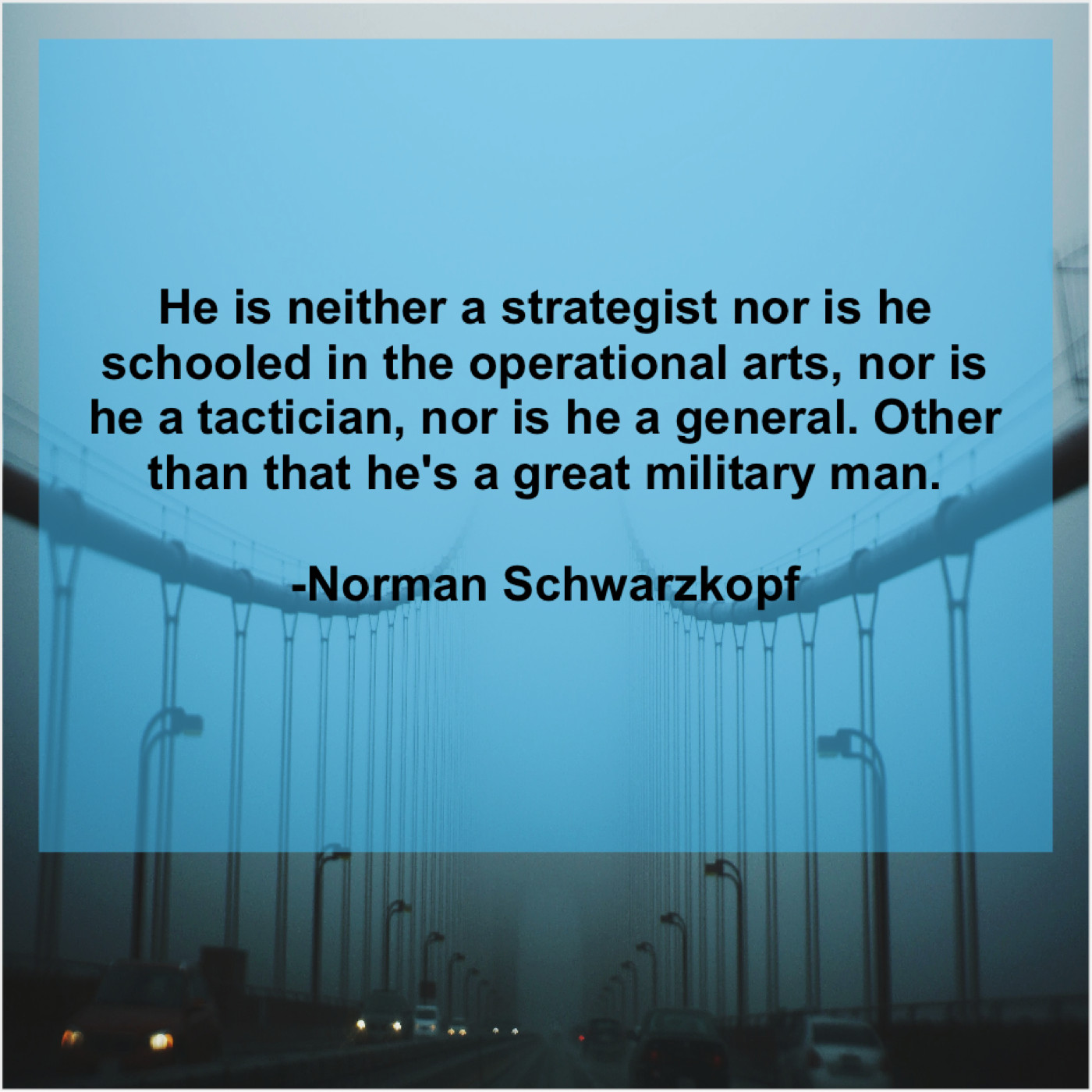 Norman Schwarzkopf Norman Schwarzkopf – He is neither a strategist… October 13, 2019 admin “He is neither a strategist nor is he schooled in the operational arts, nor is he a tactician, nor is he a general. Other than that he’s a great military man.”-Norman Schwarzkopf