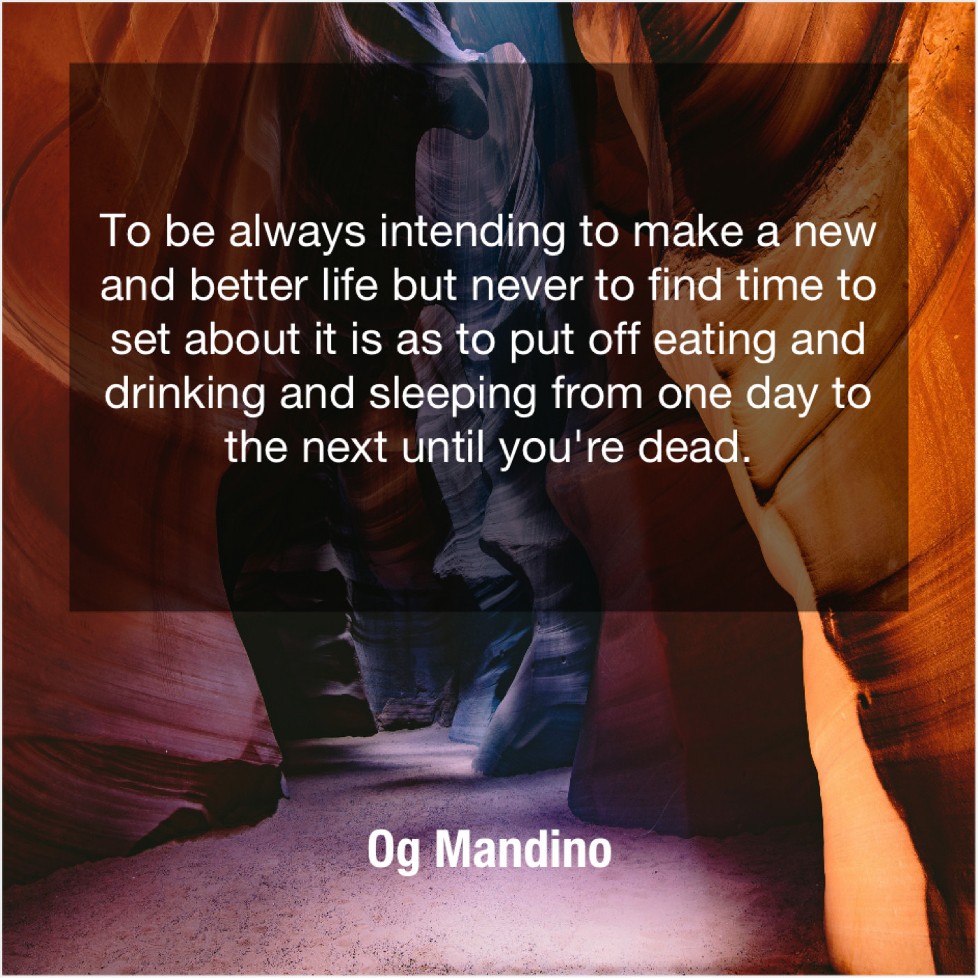 Og Mandino Og Mandino – To be always intending to… March 13, 2019 admin “To be always intending to make a new and better life but never to find time to set about it is as to put off eating and drinking and sleeping from one day to the next until you’re dead.”-Og Mandino