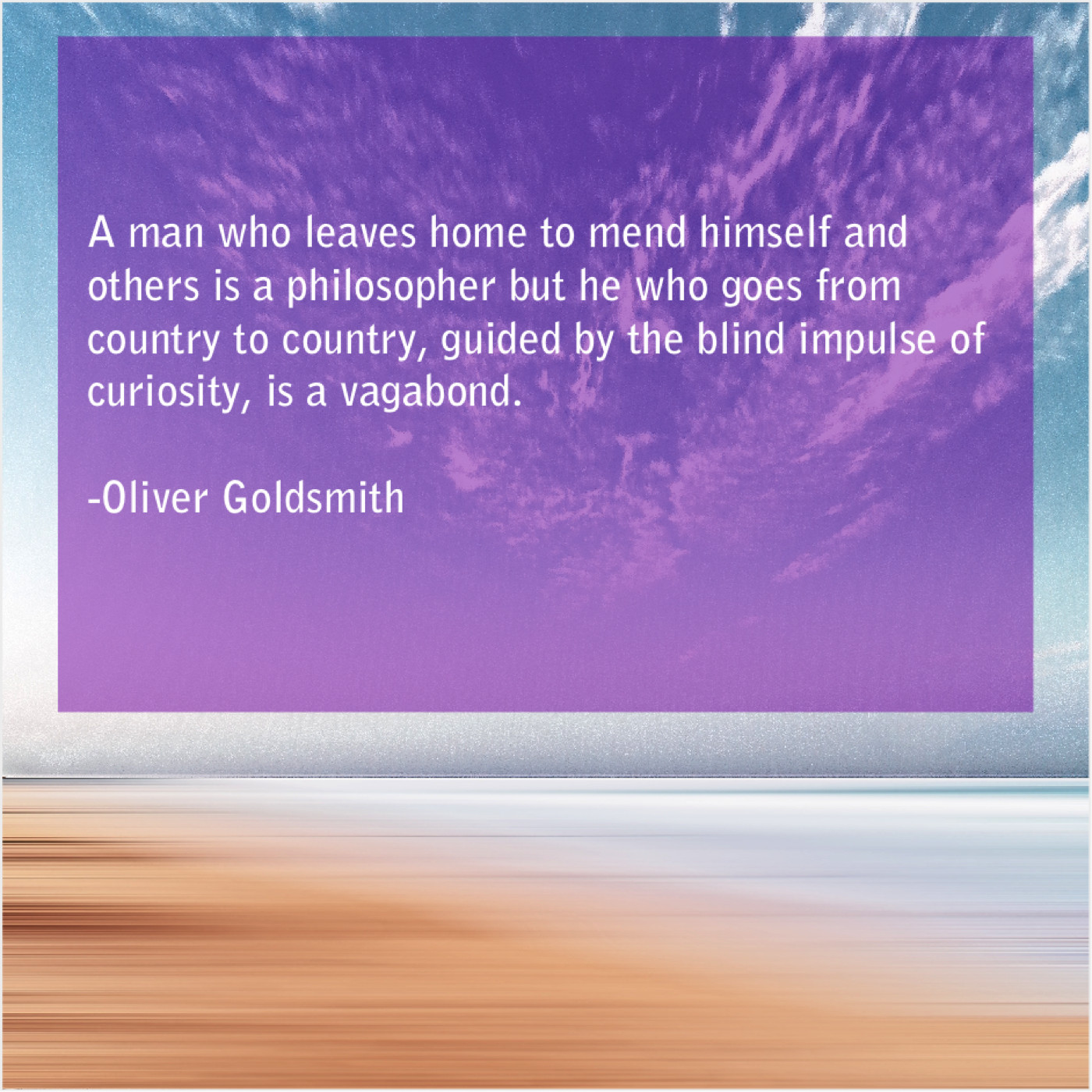 Oliver Goldsmith Oliver Goldsmith – A man who leaves home… August 12, 2019 admin “A man who leaves home to mend himself and others is a philosopher but he who goes from country to country, guided by the blind impulse of curiosity, is a vagabond.”-Oliver Goldsmith