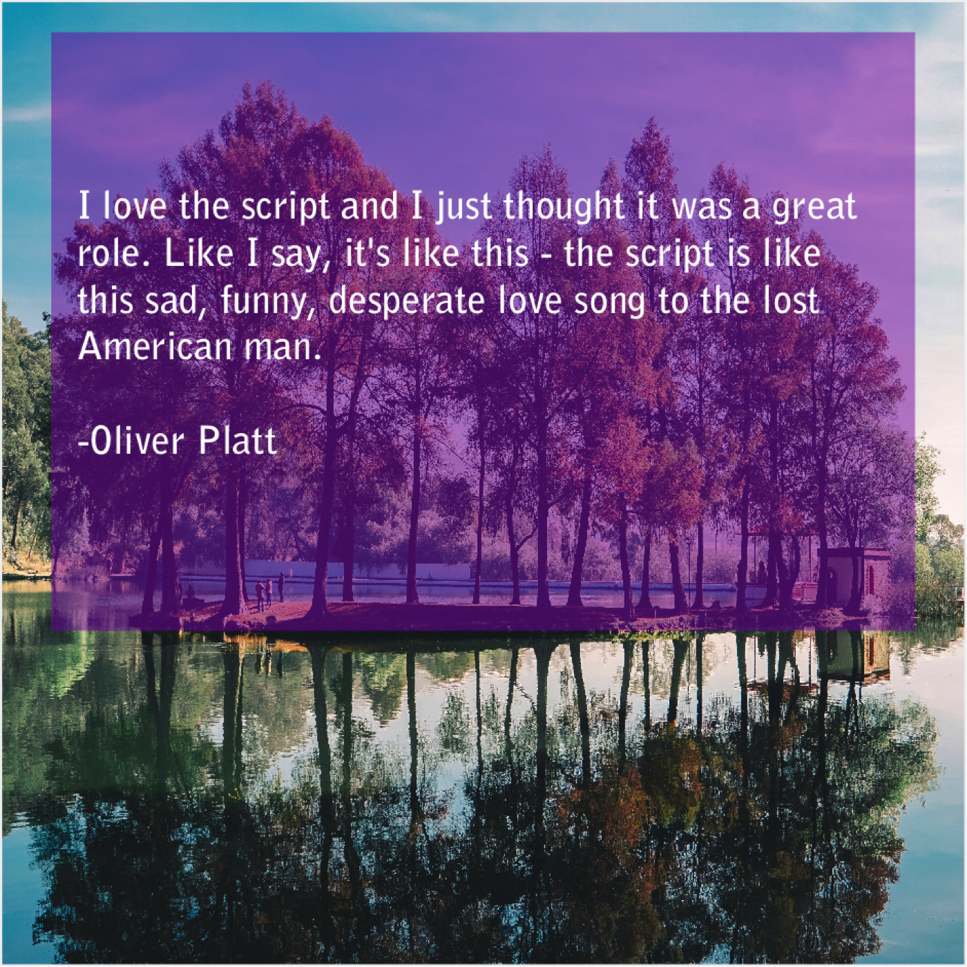 Oliver Platt Oliver Platt – I love the script and… October 29, 2018 admin “I love the script and I just thought it was a great role. Like I say, it’s like this – the script is like this sad, funny, desperate love song to the lost American man.”-Oliver Platt
