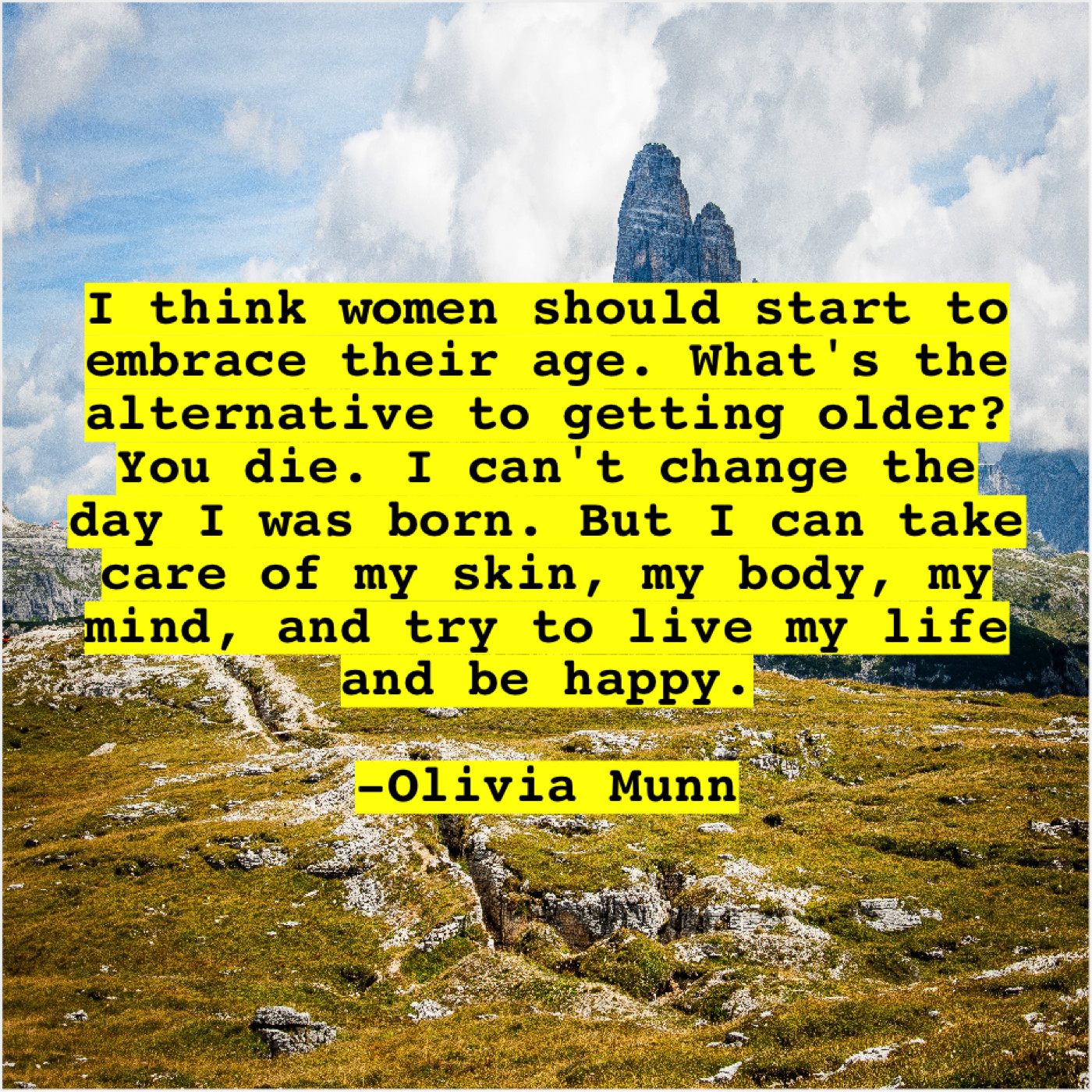 Olivia Munn Olivia Munn – I think women should start… October 26, 2018 admin “I think women should start to embrace their age. What’s the alternative to getting older? You die. I can’t change the day I was born. But I can take care of my skin, my body, my mind, and try to live my life and be happy.”-Olivia Munn