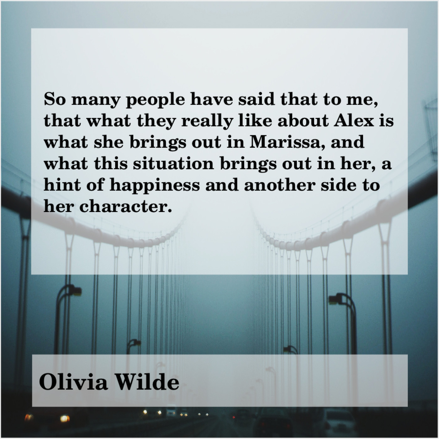Olivia Wilde Olivia Wilde – So many people have said… June 23, 2019 admin “So many people have said that to me, that what they really like about Alex is what she brings out in Marissa, and what this situation brings out in her, a hint of happiness and another side to her character.”-Olivia Wilde